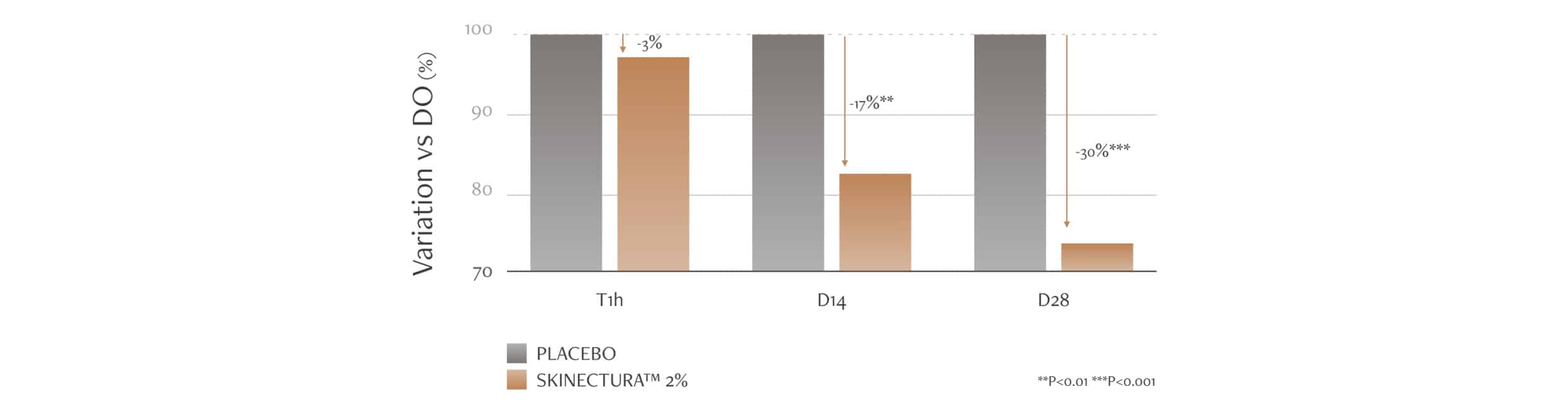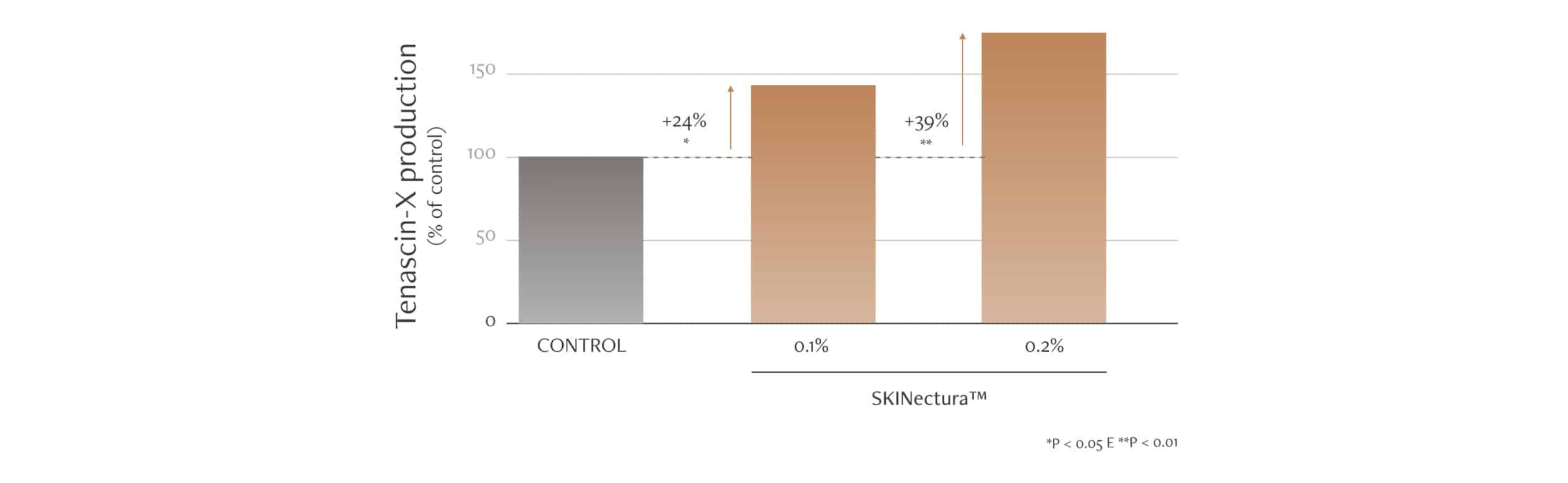 Estudos in vitro realizados com o Skinectura™ (0,1% e 0,2%) mostraram que, em apenas 24 horas, houve um aumento de 24% e de 39%, respectivamente, na síntese de Tenascina-X. Em outras palavras, quanto maior a concentração do ativo, maior foi a resposta da pele.