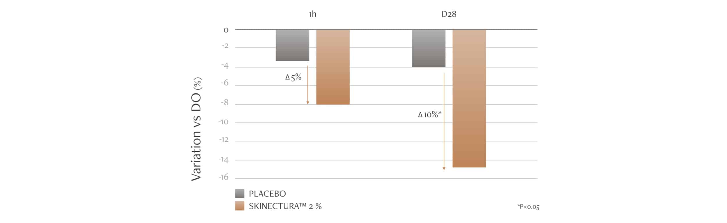Nas imagens acima é possível observar os resultados do teste feito com um creme contendo 2% de Skinectura™, aplicado na área dos olhos. Após 1h da aplicação, a profundidade das rugas diminui em 5% em comparação ao creme placebo. Já 28 dias depois, esse percentual subiu para 10%.