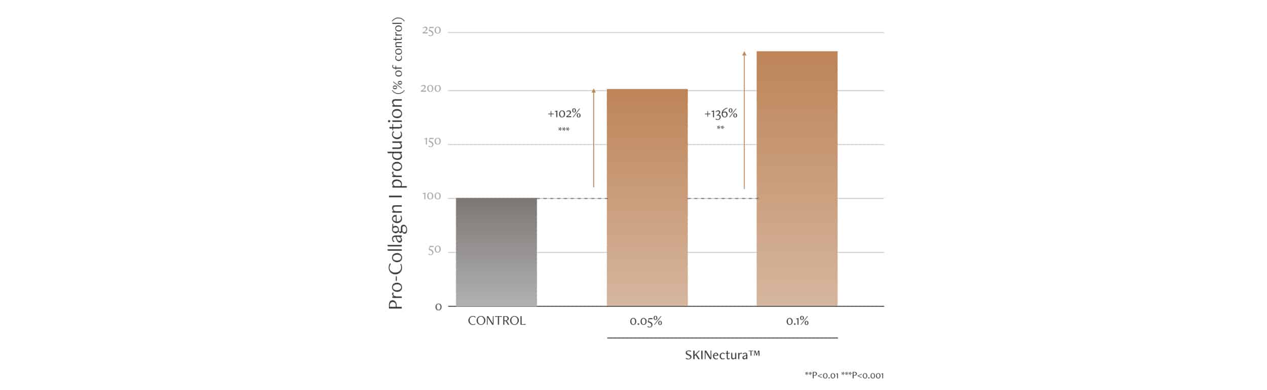 Um estudo in vitro foi realizado para determinar o efeito do Skinectura™ nas concentrações 0,05% e 0,1% na estimulação da síntese de pró-colágeno tipo 1 em fibroblastos, durante 24h. Para entender melhor, o pró-colágeno é um precursor do colágeno (é a sua forma inicial). Após a sua síntese, o pró-colágeno é convertido em tropocolágeno, que depois forma as fibras de colágeno.