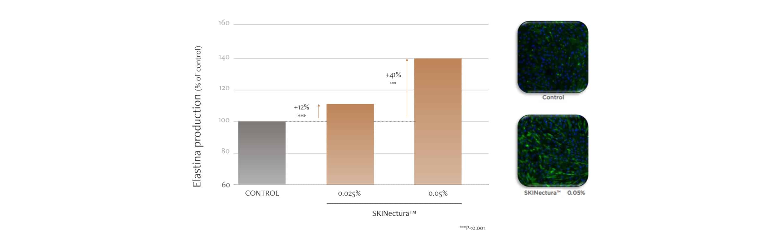 Outro estudo também observou o efeito do ativo na síntese de elastina em fibroblastos durante 24h, em concentrações de 0,025% e 0,05%. Nesse caso, o aumento observado foi de 12% e 41%, respectivamente, demonstrando o efeito positivo do Skinectura™ na produção dessa proteína que é fundamental para a melhora na elasticidade da pele.
