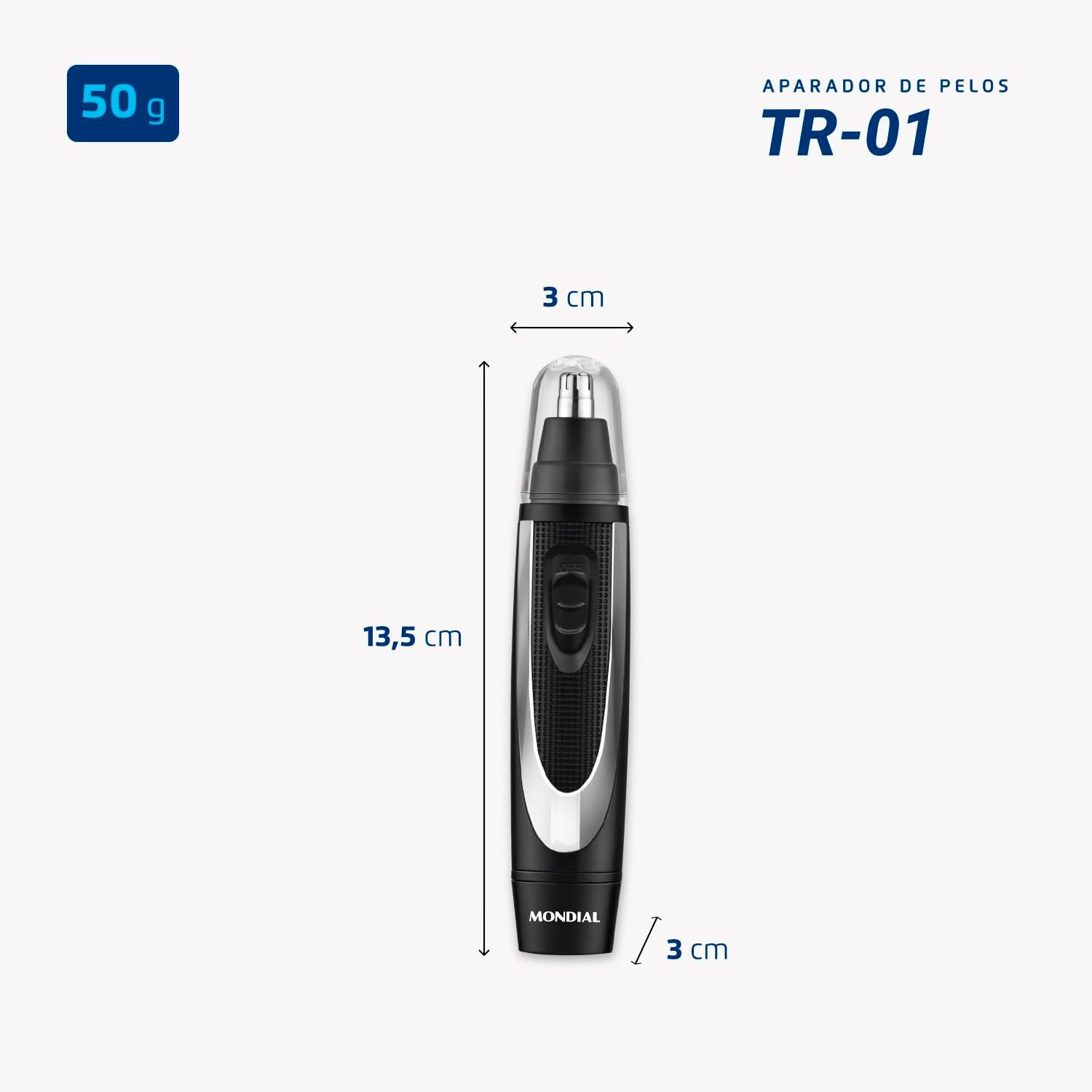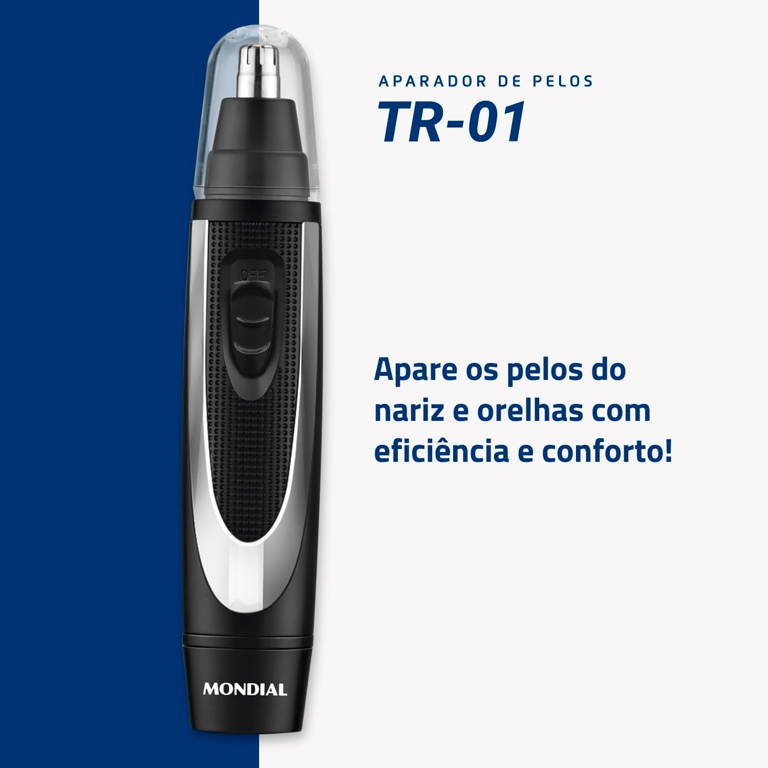 O Aparador de Pelos Mondial TR-01 remove os pelos indesejados do nariz e orelhas de maneira rápida e eficiente. As lâminas rotativas são supereficientes e aparam os pelos instantaneamente. Possui design compacto e leve, o que facilita o manuseio, e funciona com apenas 1 pilha AA. Saiba mais sobre o TR-01 da Mondial: