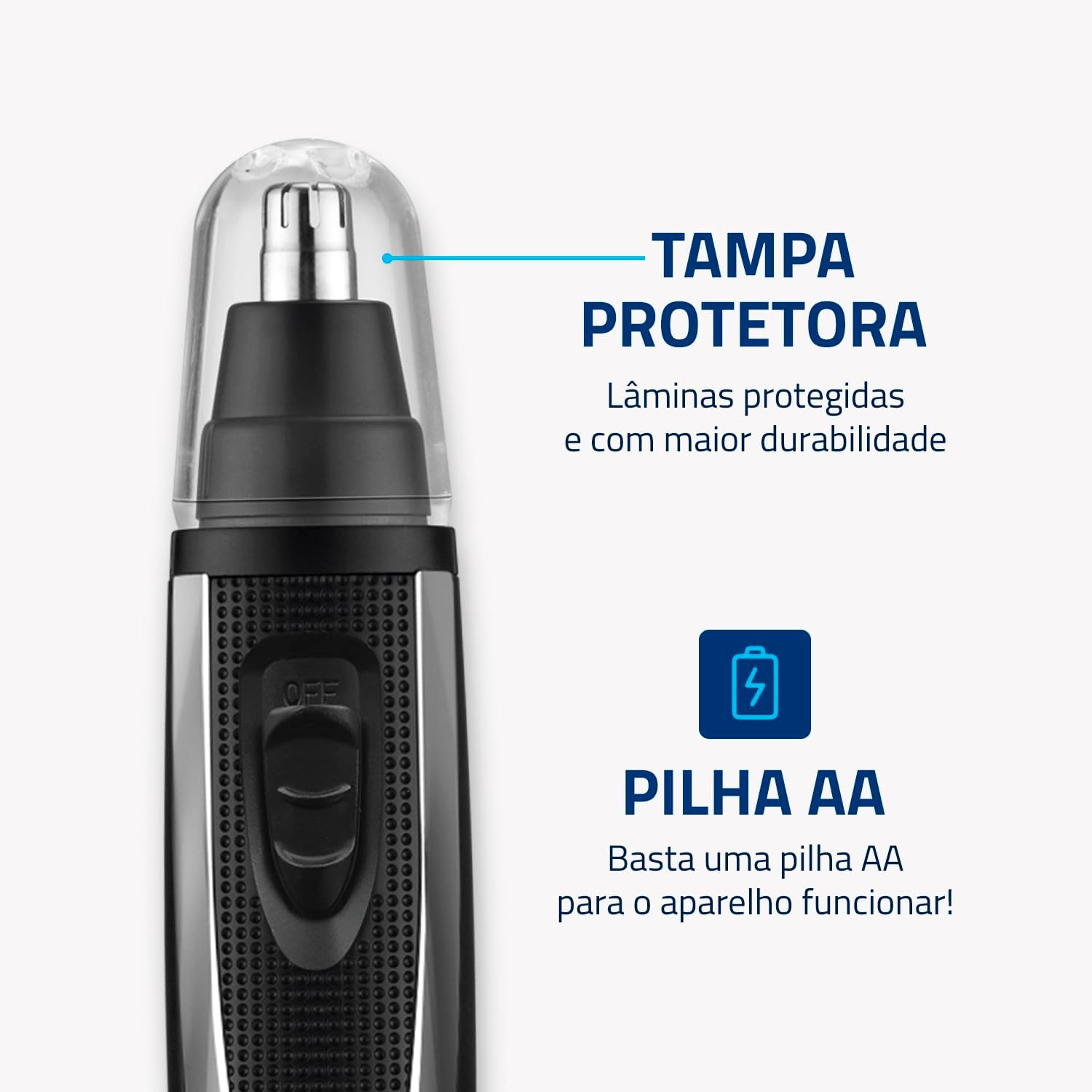 PILHA AA: Prático para usar em qualquer lugar, o aparador de pelos funciona com apenas 1 pilha AA.