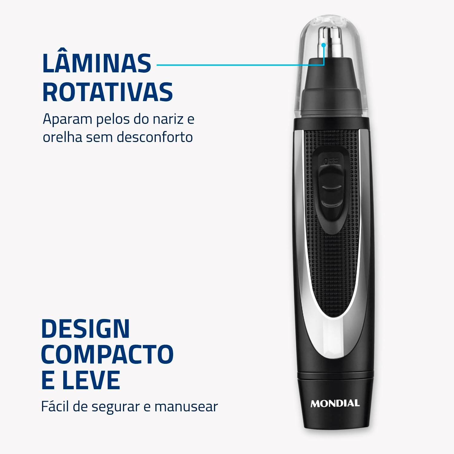 LÂMINAS ROTATIVAS: Lâminas supereficientes para aparar os pelos do nariz e das orelhas de maneira rápida e sem desconforto.