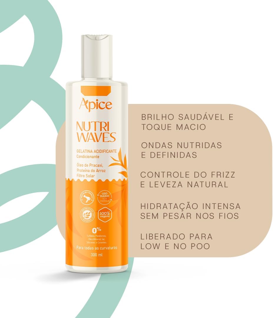 A Gelatina Acidificante e Condicionante Nutri Waves da Ápice Cosméticos é ideal para quem busca a definição do cabelo com aparência natural e toque leve. Sua fórmula acidificante equilibra o pH dos fios (entre 2,5 e 3,5), promovendo selagem suave das cutículas e potencializando a retenção de ativos. Pode ser utilizada sozinha ou combinada com o creme de pentear da linha, tanto nos cabelos molhados quanto secos. Com tecnologia exclusiva SuperWave, composta por polissacarídeos naturais extraídos da semente de linhaça e chia, o produto ativa e fixa a curvatura dos fios, mantendo o movimento sem rigidez. A presença da Proteína do Arroz oferece ação antioxidante e reparadora, restaurando a fibra capilar danificada, enquanto o Óleo de Pracaxi hidrata, protege contra agressões térmicas e facilita o desembaraço, reduzindo o frizz e promovendo brilho intenso. A gelatina é indicada para todas as curvaturas, inclusive para uso em crianças a partir de 3 anos. Sua fórmula é dermatologicamente testada, 100% vegana, não testada em animais e livre de componentes agressivos como sulfatos, parabenos, silicones, sal, óleo mineral e corantes. Com textura leve e efeito não pegajoso, a gelatina pode ser usada diariamente para finalizar ou reati os cachos no day after. Não é necessário enxágue. Modo de uso: Com os cabelos molhados ou secos, aplique a Gelatina Nutri Waves espalhando com os dedos ou com o auxílio de um pente e, finalize como desejar. Para definição extra, combine com o Creme de Pentear Nutri Waves. Use diariamente e, após a secagem, quebre o efeito “durinho” com um sérum ou óleo vegetal 100%. Precauções: Uso externo. Em caso de contato com os olhos, enxágue com água em abundância. Em caso de irritação, suspenda o uso e procure orientação médica. Mantenha fora do alcance de crianças. Conserve em local fresco, ao abrigo da luz. Dica de especialista: Para cachos mais definidos, hidratados e com brilho duradouro, utilize a Gelatina Nutri Waves em conjunto com os demais produtos da linha Nutri Waves da Ápice Cosméticos.