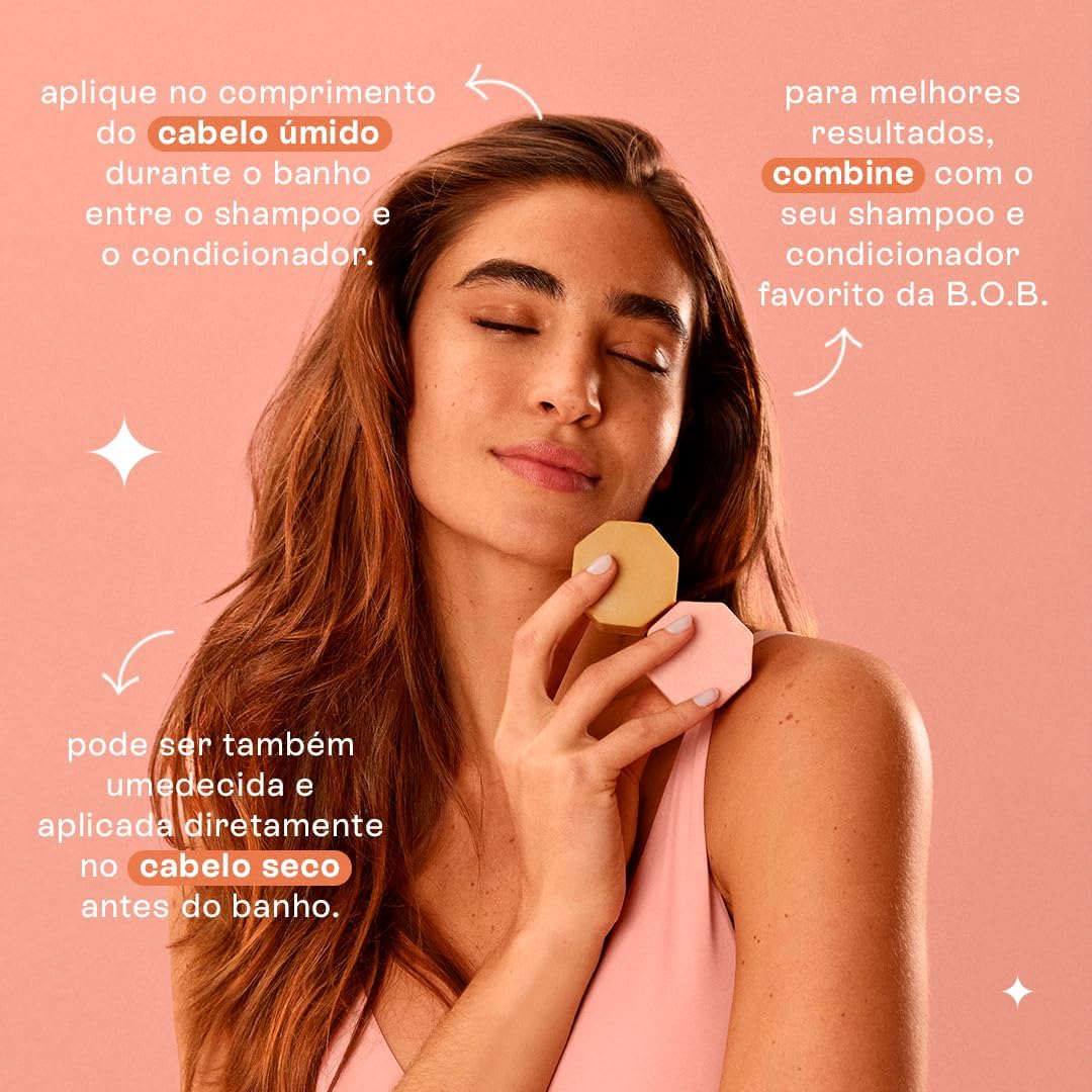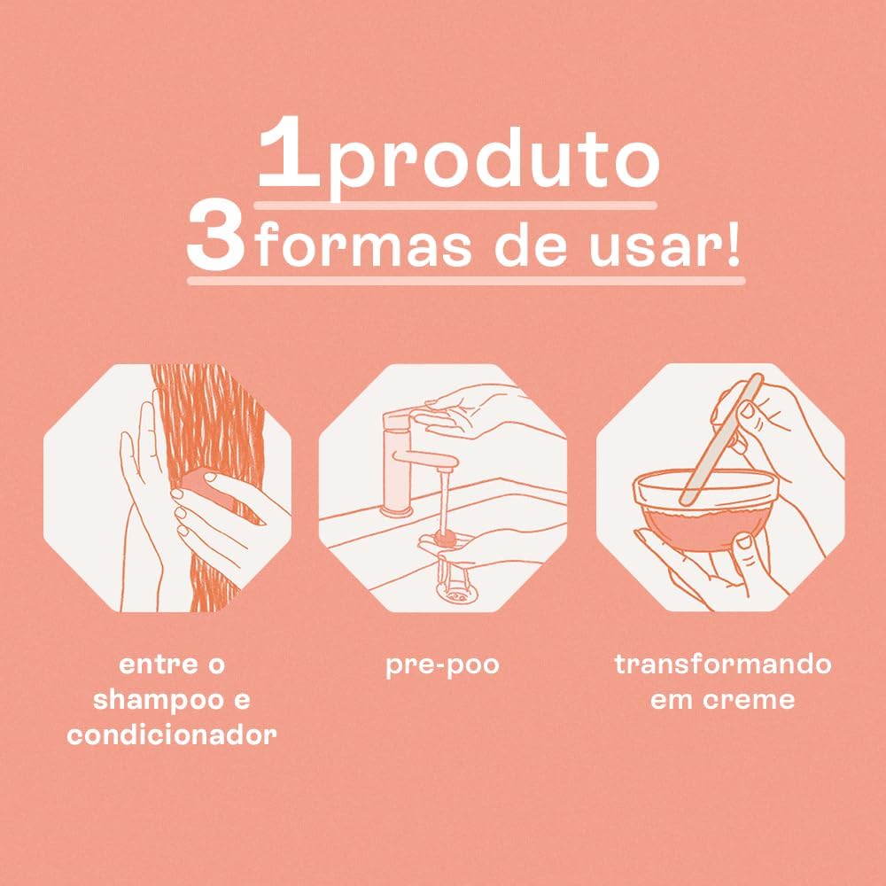 INSTRUÇÕES FÁCEIS: 1 produto, 3 maneiras de usá-lo. Primeiro, você pode aplicar o produto diretamente nos cabelos úmidos durante o banho, entre o shampoo e o condicionador. Segundo, você pode usá-lo como pré-poo, e por último, você pode derretê-lo em água morna para obter uma textura cremosa e aplicá-lo normalmente.
