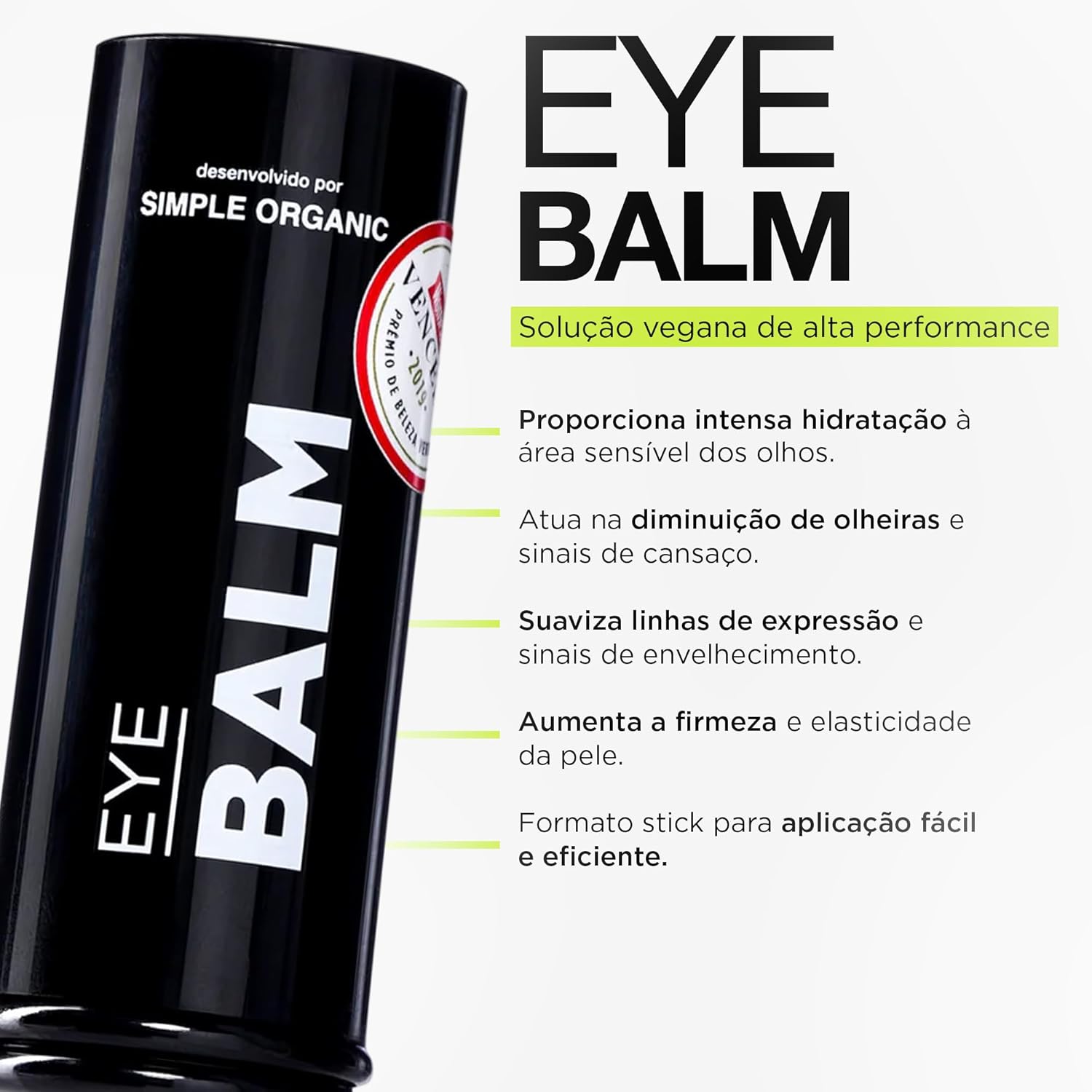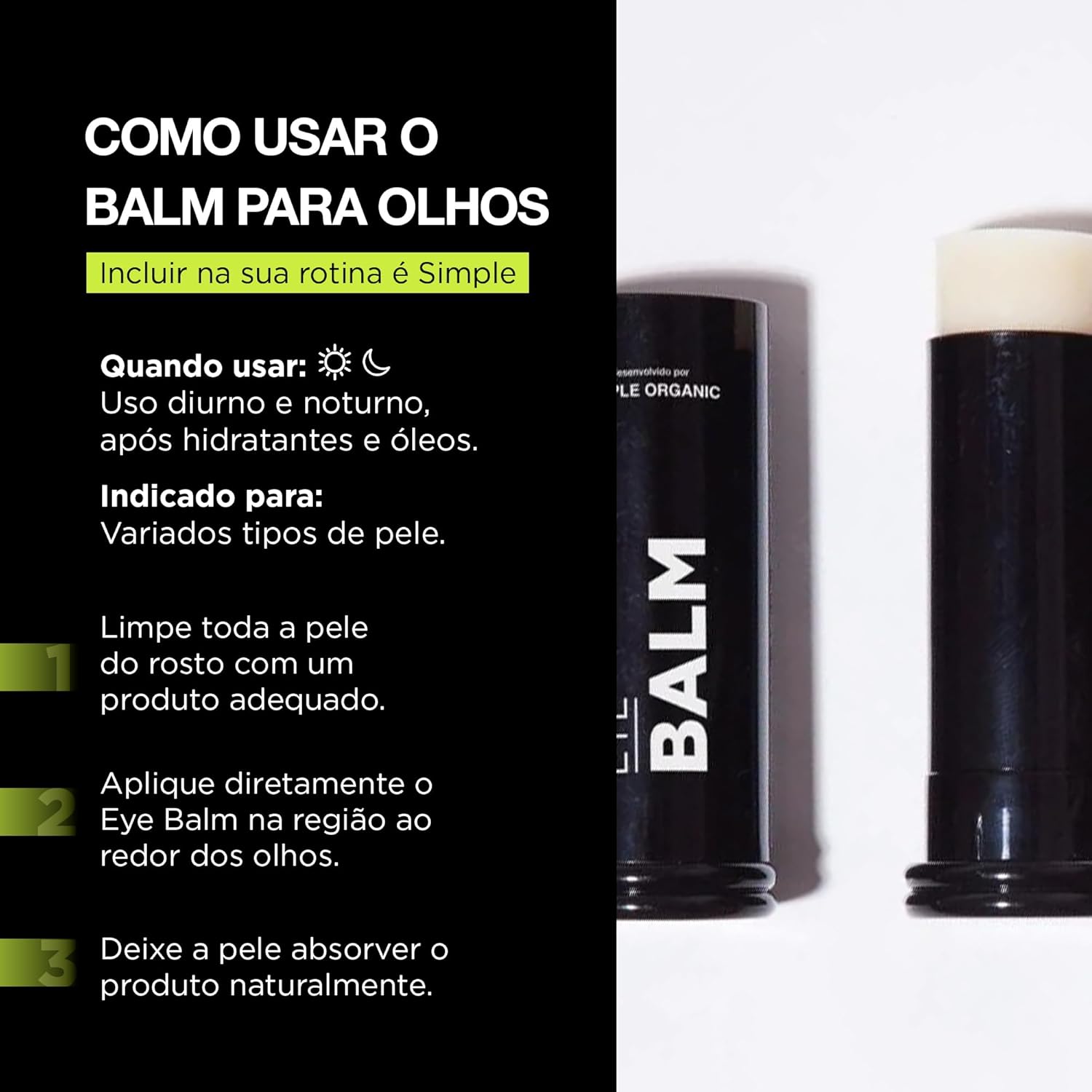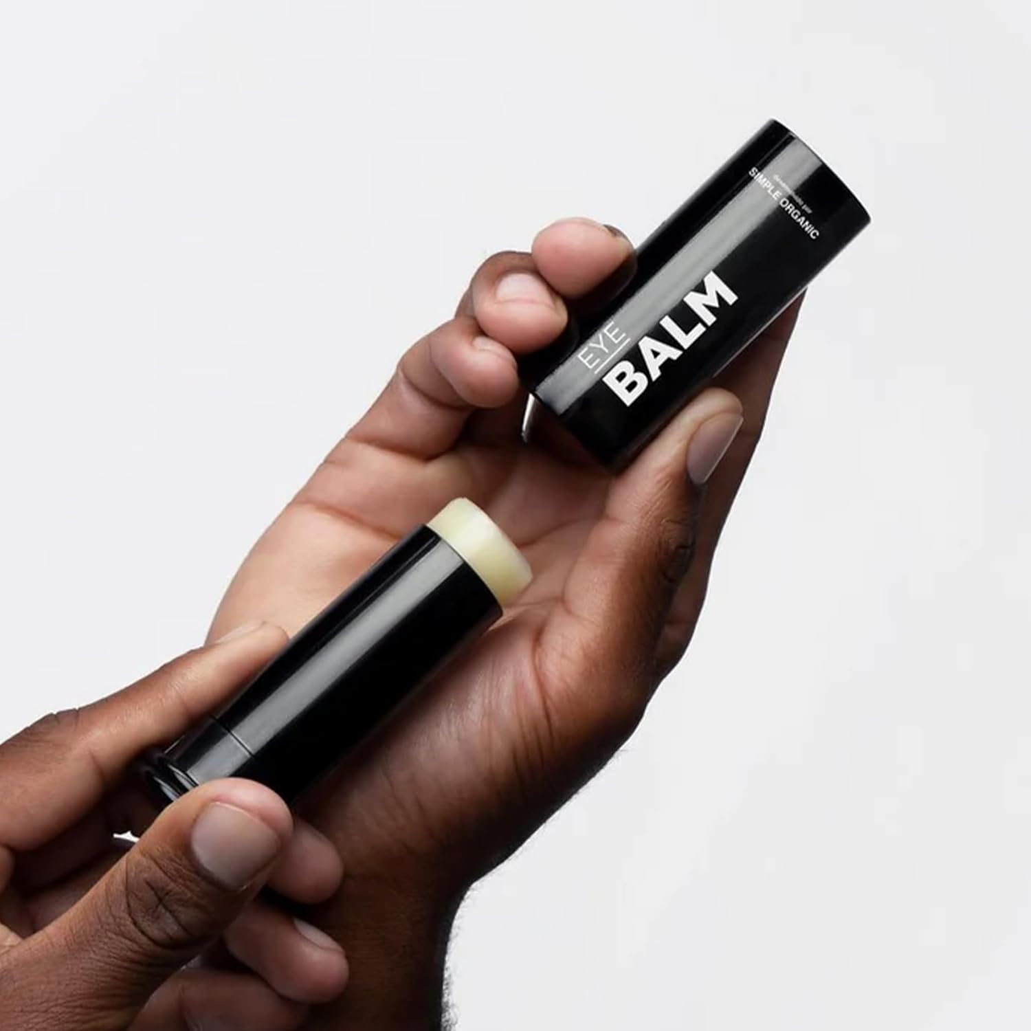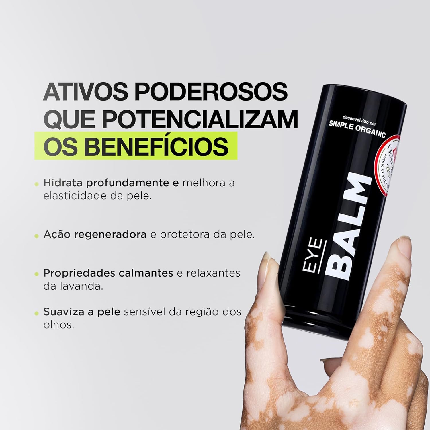 O Eye Balm da Simple Organic é um stick multifuncional para a área dos olhos, desenvolvido para hidratar, suavizar linhas finas e reduzir a aparência de olheiras.