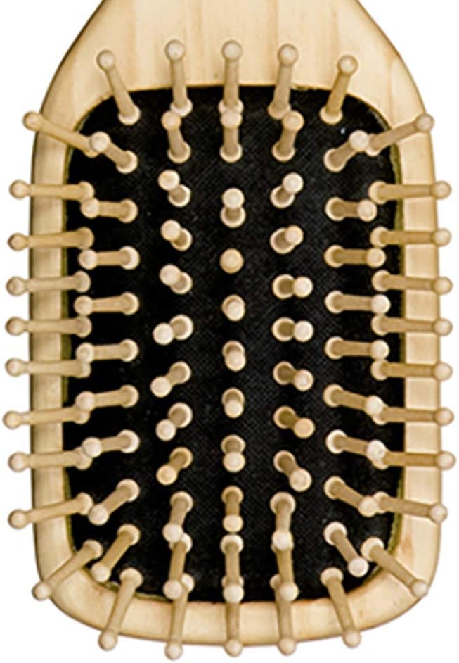 Escova Wood quadrada pequena com pinos de madeira que reduzem a eletricidade estática, evitando o frizz, ideal para todos os tipos de cabelo.