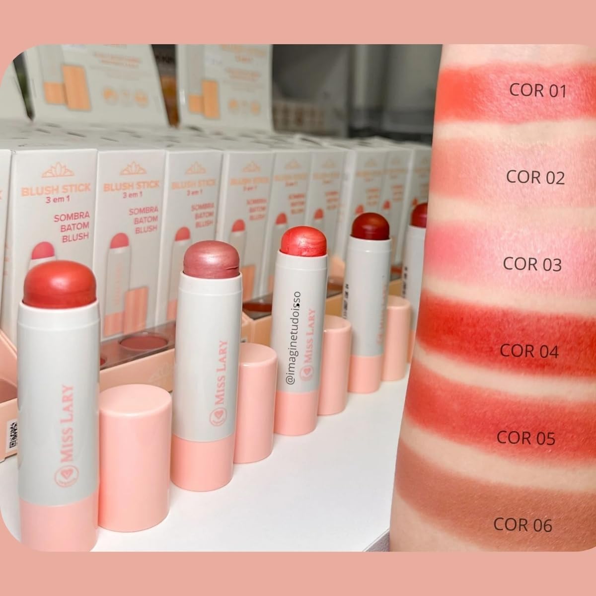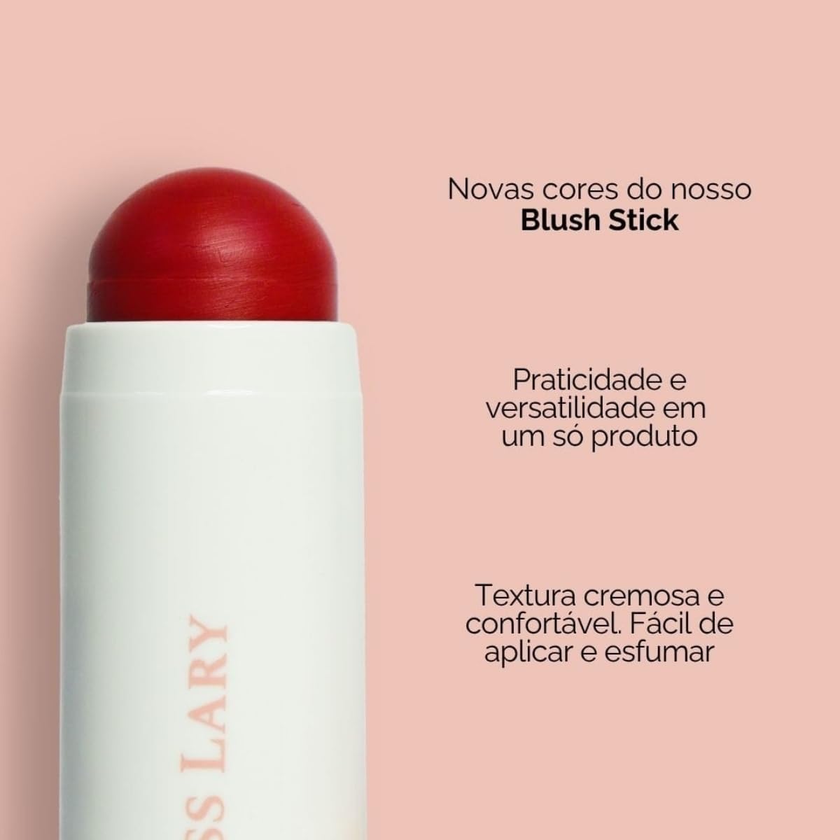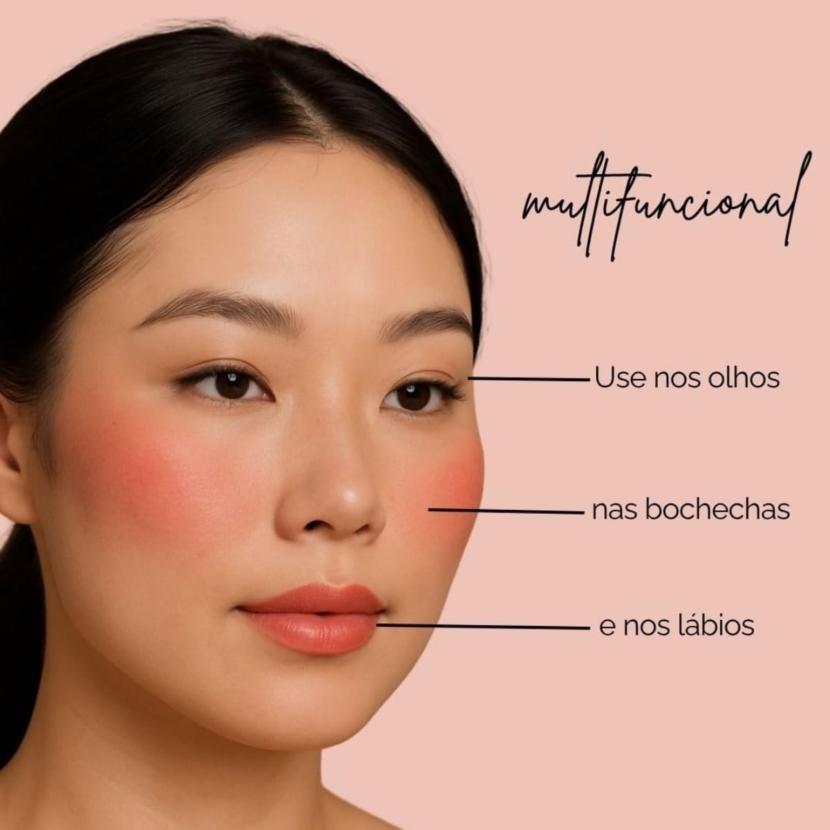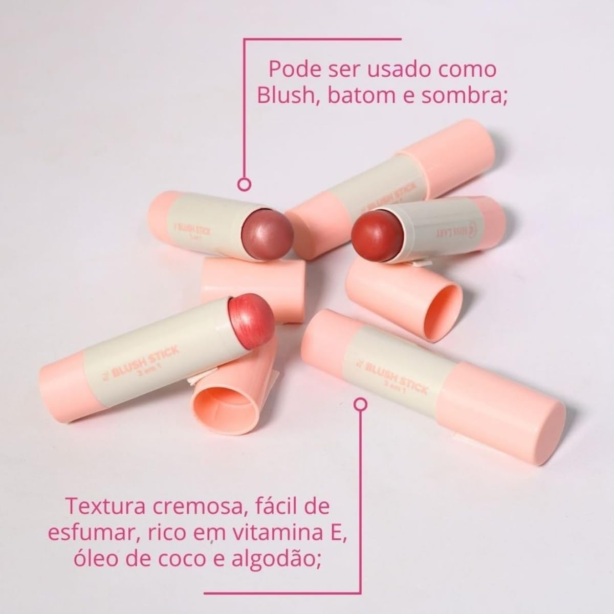 VERSATILIDADE: Blush stick 3 em 1 pode ser usado em bochechas, olhos e lábios, oferecendo múltiplas possibilidades de maquiagem