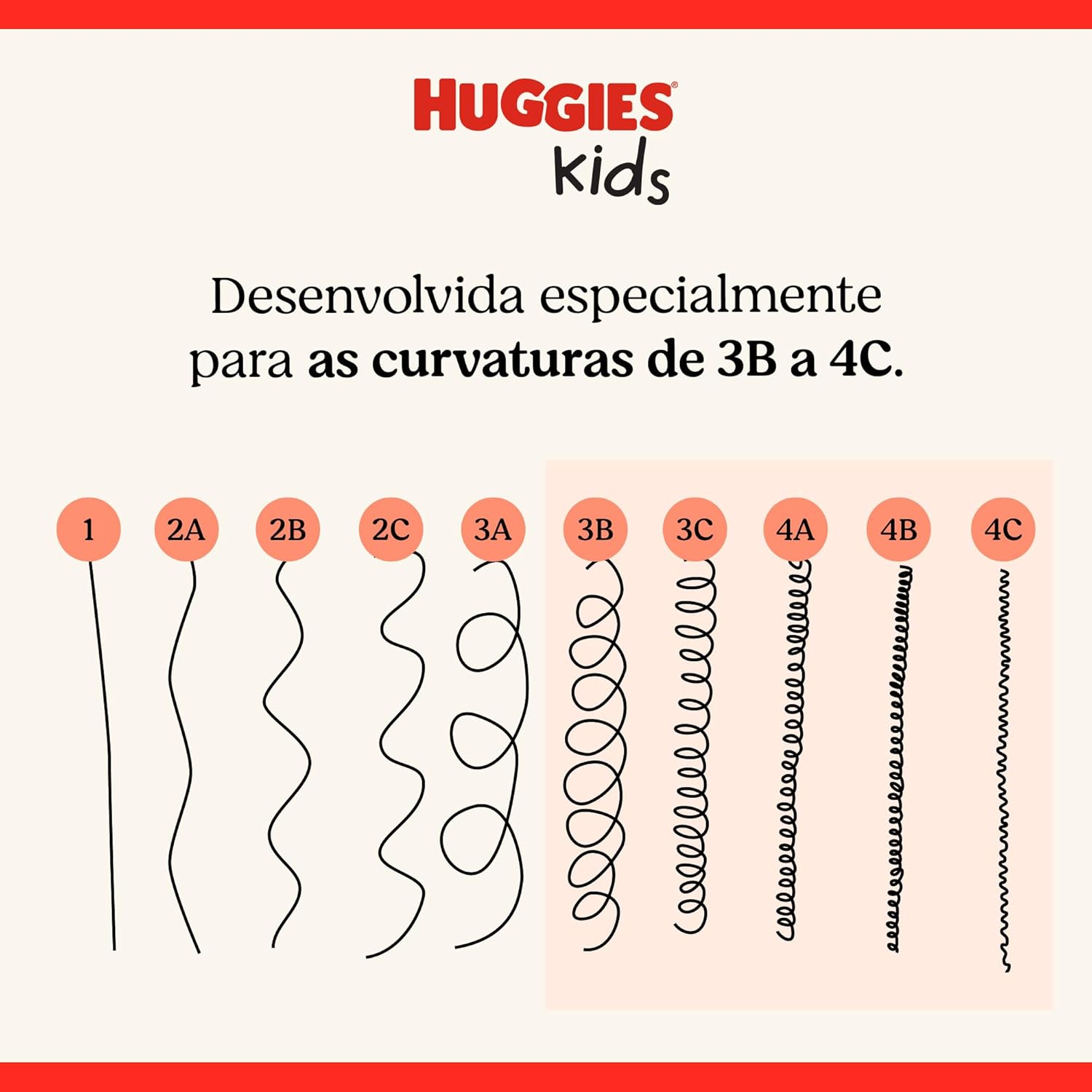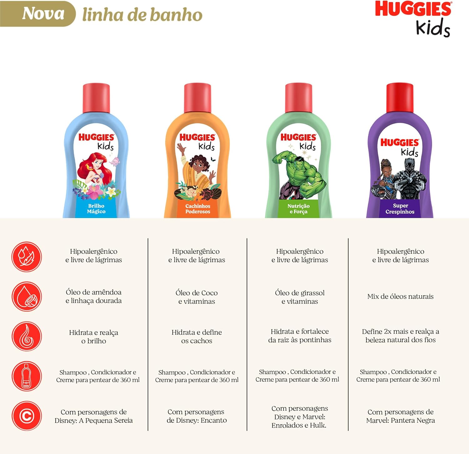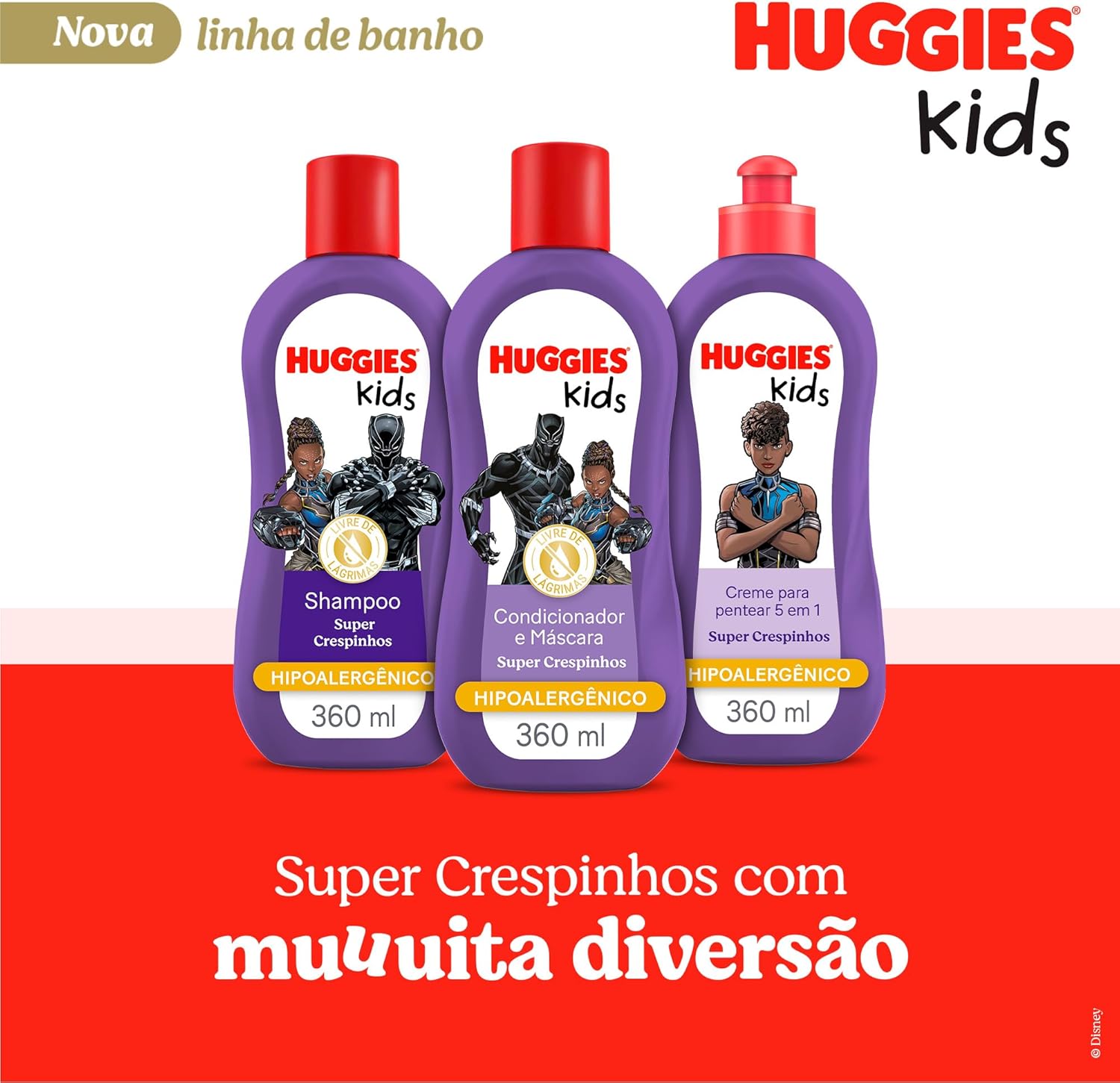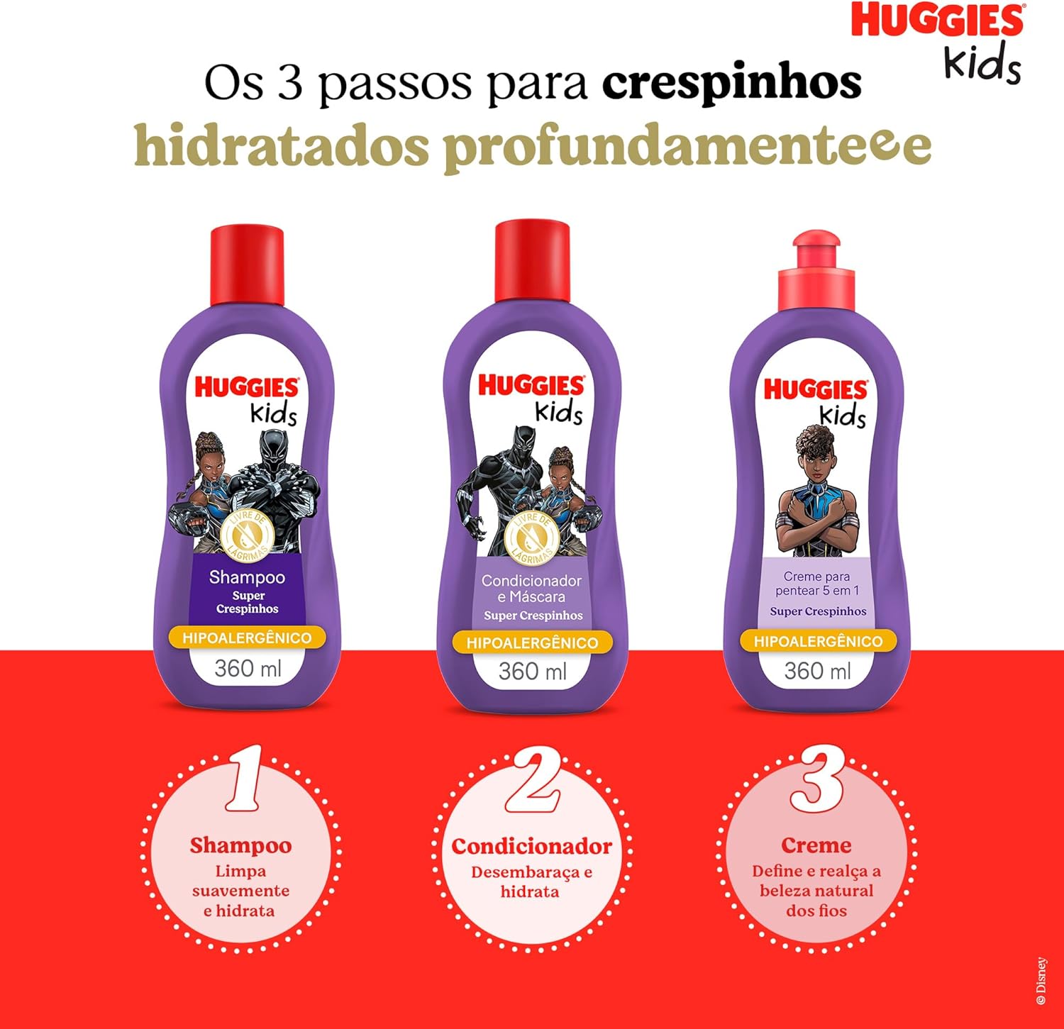 Huggies Kids possui 4 linhas completas para cuidar do cabelo de todas as crianças! Todas possuem Shampoo, Condicionador e Creme para Pentear com 360ml. SUPER CRESPINHOS A linha Super crespinhos proporciona Crespos naturalmente hidratados e Fortes da raiz às pontinhas para cabelos com curvatura 4A a 4C! Com Mix de óleos naturais, livre de lágrimas e seguro para todas as idades! Experimente os 3 passos para um resultado completo: 1 Shampoo, 2 Condicionador e 3 Creme para pentear.