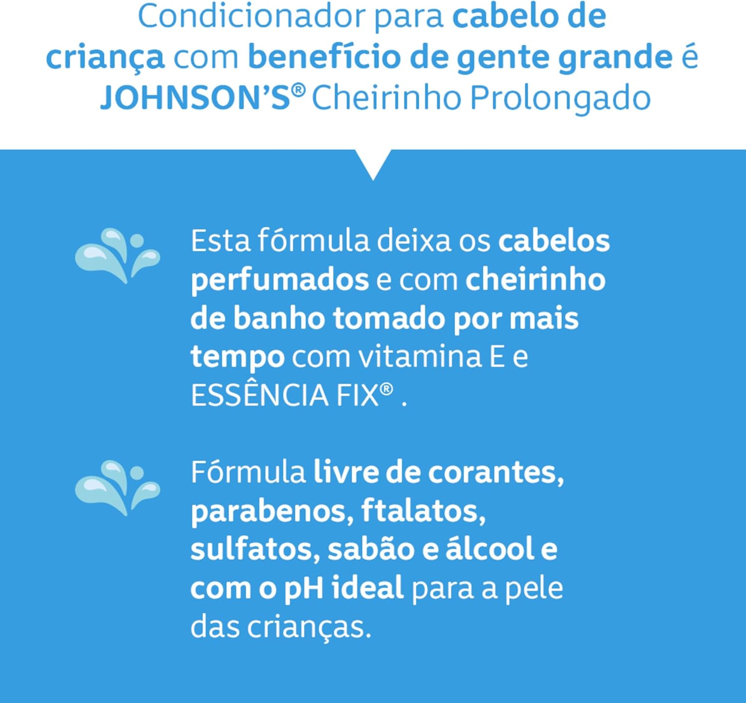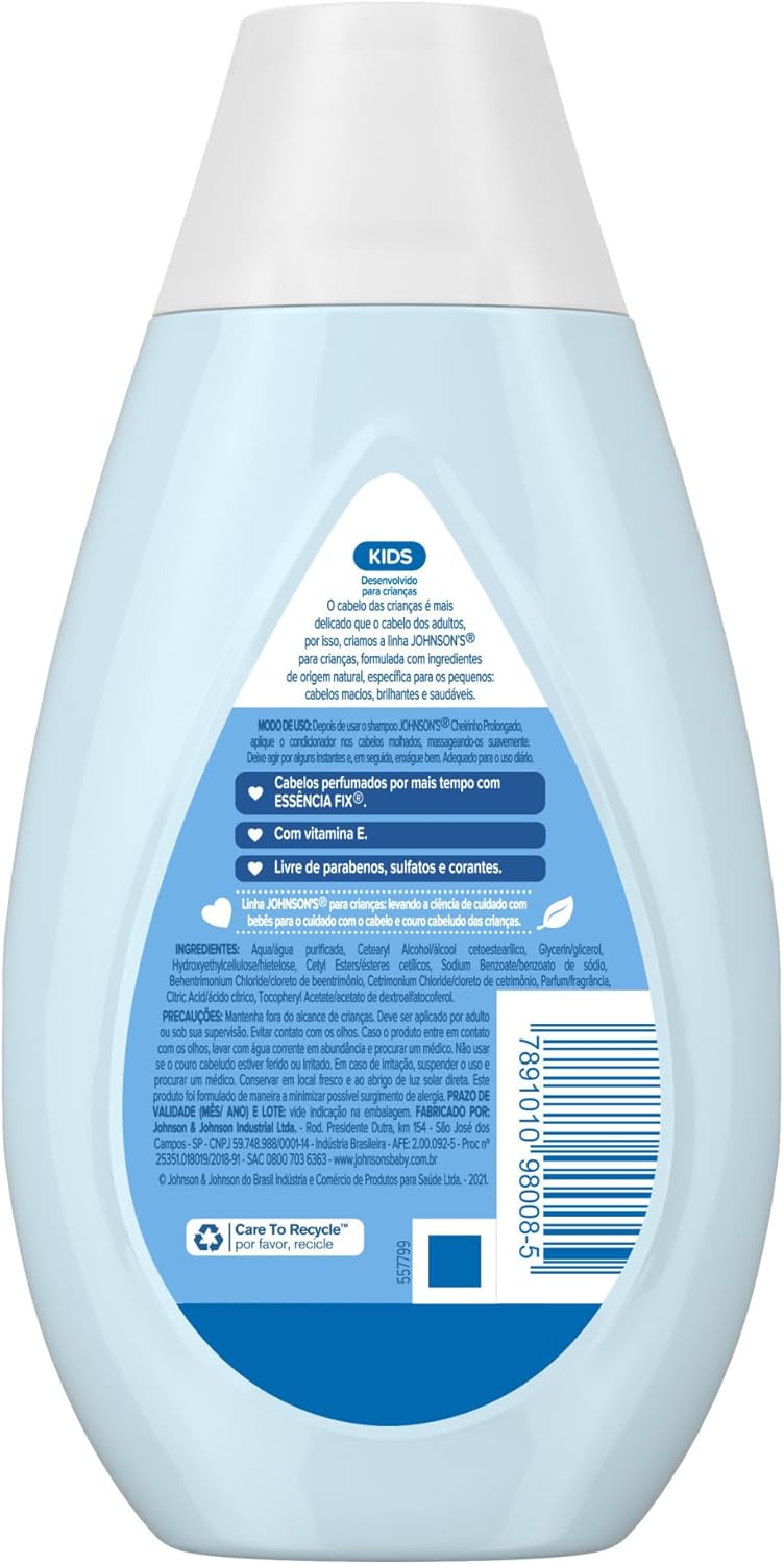 O cabelo das crianças é mais fino e delicado que o cabelo dos adultos. Por isso, criamos a linha JOHNSON’S® desenvolvida para crianças, formulada com ingredientes naturais específicos para os pequenos: cabelos macios, brilhantes e saudáveis. O Condicionador Infantil JOHNSON’S® Cheirinho Prolongado, 200mL deixa os cabelos cheirosos por muito mais tempo por conta da tecnologia ESSÊNCIA FIX®. Especialmente desenvolvido para crianças com cabelos delicados, deixa um cheirinho de banho tomado, além de contar com a exclusiva fórmula CHEGA DE LÁGRIMAS®, que evita irritação nos olhos. Toda a linha é hipoalergênica, formulada para ser suave, livre de corantes, parabenos, sulfatos e ftalatos. Com pH fisiológico e dermatologicamente testado. Frasco com 20% de plástico reciclado, cuidando do seu bebê e do futuro do nosso planeta. Benefícios e diferenciais – Cabelos cheirosos por mais tempo – Com vitamina E e ESSÊNCIA FIX® – A fórmula CHEGA DE LÁGRIMAS® permite uma experiência sem choro, por ser suave aos olhos. – Hipoalergênico, formulado para ser suave – Livre de ingredientes que são agressivos à pele da criança (corantes, parabenos, ftalatos e sulfato) – pH ideal para a delicada pele da criança – Dermatologicamente testado Como usar Depois de usar o baby shampoo JOHNSON’S® Cheirinho Prolongado, aplique o condicionador nos cabelos molhados, massageando-os suavemente. Deixe agir por alguns instantes e, em seguida, enxágue bem. Adequado para o uso diário. Indicação de uso: Para crianças de todas as idades Composição Aqua/água purificada, Cetearyl Alcohol/álcool cetoestearílico, Glycerin/glicerol, Hydroxyethylcellulose/hietelose, Cetyl Esters/ésteres cetílicos, Sodium Benzoate/benzoato de sódio, Behentrimonium Chloride/cloreto de beentrimônio, Cetrimonium Chloride/cloreto de cetrimônio, Parfum/fragrância, Citric Acid/ácido cítrico, Tocopheryl Acetate/acetato de dextroalfatocoferol. Precauções Mantenha fora do alcance de crianças. Deve ser aplicado por adulto ou sob sua supervisão. Evitar contato com os olhos. Caso o produto entre em contato com os olhos, la com água corrente em abundância e procurar um médico. Não usar se o couro cabeludo estiver ferido ou irritado. Em caso de irritação, suspender o uso e procurar um médico. Conser em local fresco e ao abrigo da luz solar direta. Este produto foi formulado de maneira a minimizar possível surgimento de alergia.