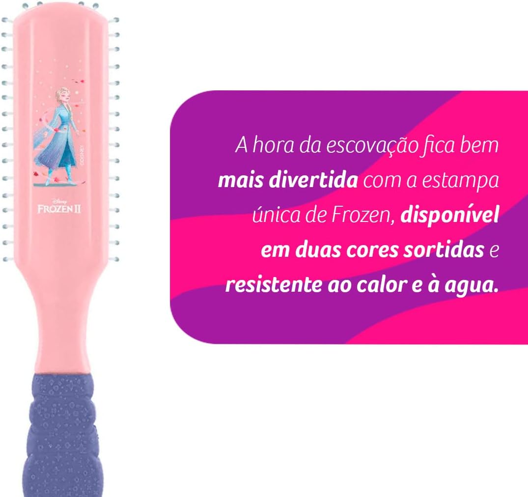 LEVE A DIVERSÃO DE FROZEN PARA OS CABELOS. A hora da escovação fica bem mais divertida com a estampa única de Frozen, disponível em duas cores sortidas e resistente ao calor e à agua.