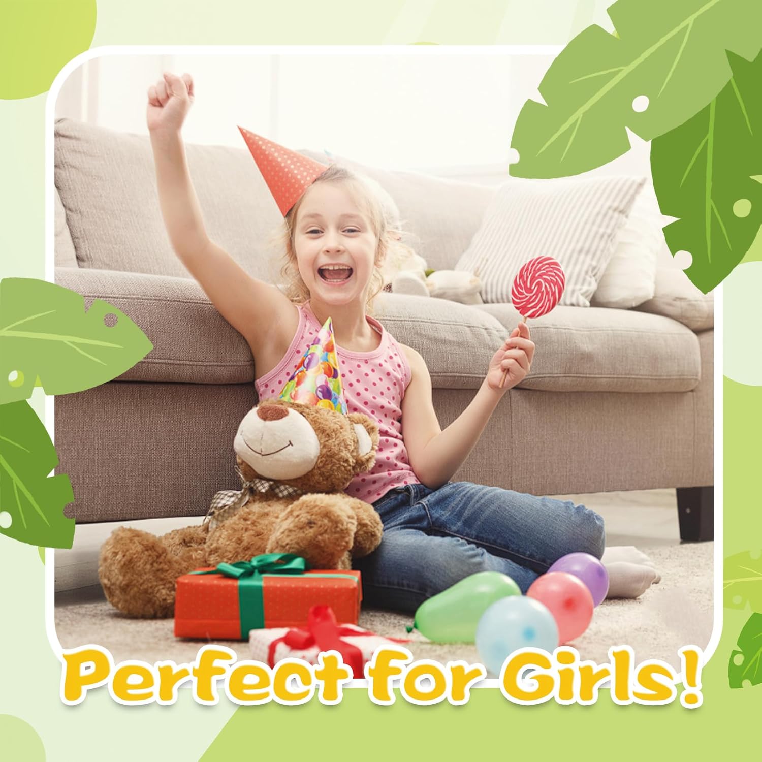 Criança sorridente usando um vestido branco e tiara rosa em forma de coroa, segurando um pirulito vermelho contra um fundo branco.Criança sorridente usando um vestido branco e tiara rosa em forma de coroa, segurando um pirulito vermelho contra um fundo branco.
