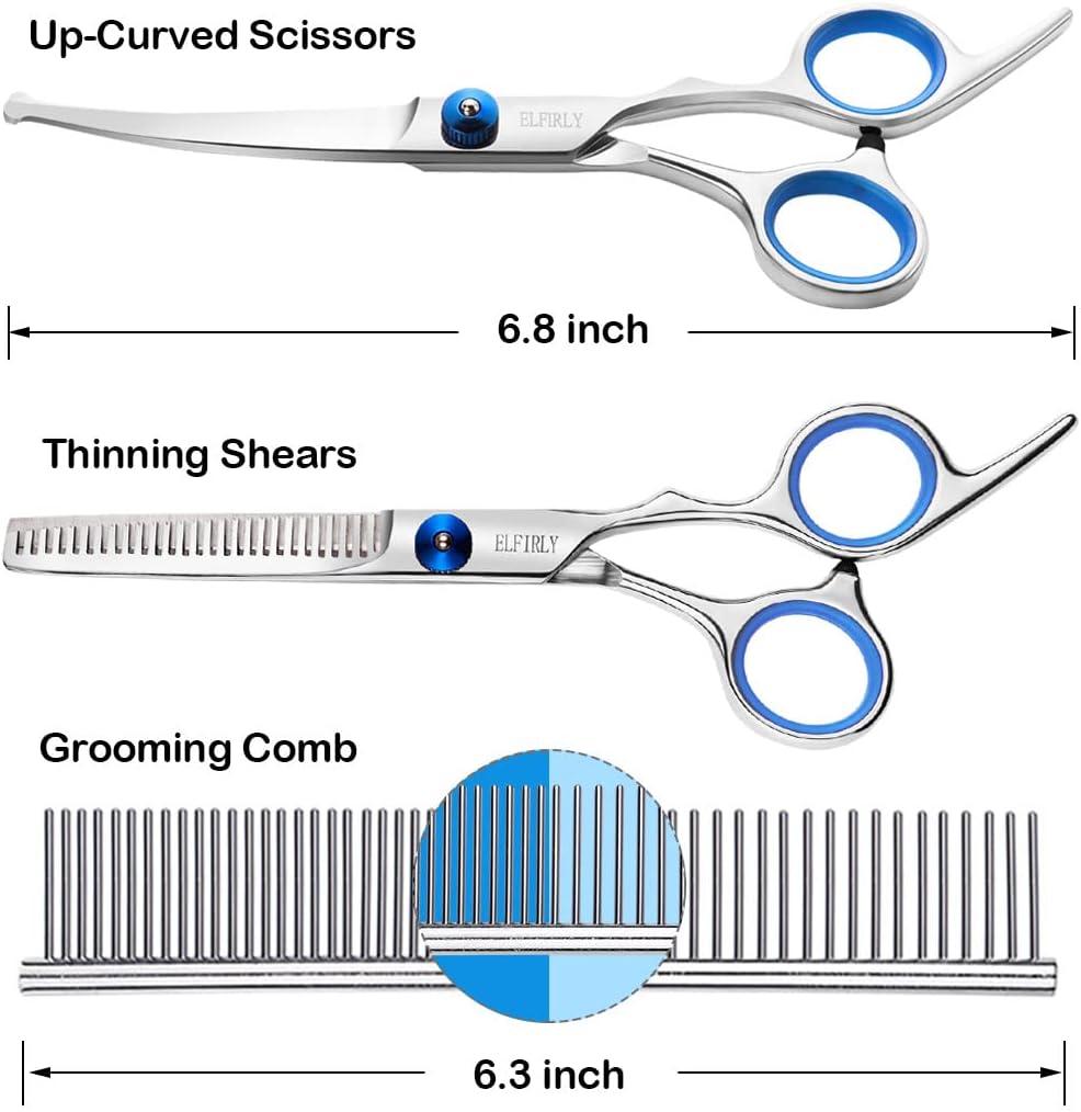 Kit de duas tesouras de cuidados – Tesoura profissional para cães com 1 tesoura curva, 1 tesoura de desbaste, 1 pente de tosa, pode aparar pelo do corpo com lâminas lisas.