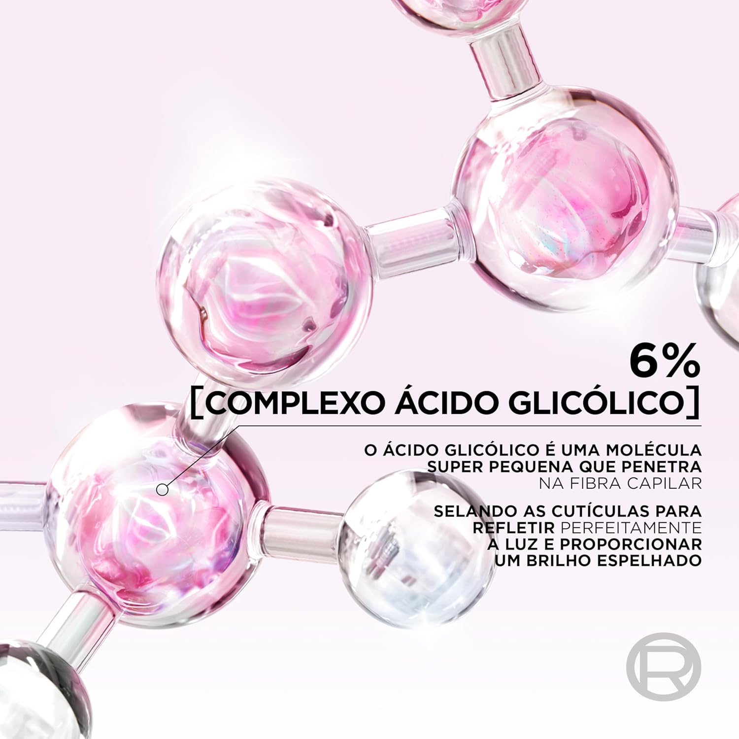Fórmula com PH Ácido rica em Ácido Glicólico, combatendo a porosidade e selando as cutículas para um brilho gloss.