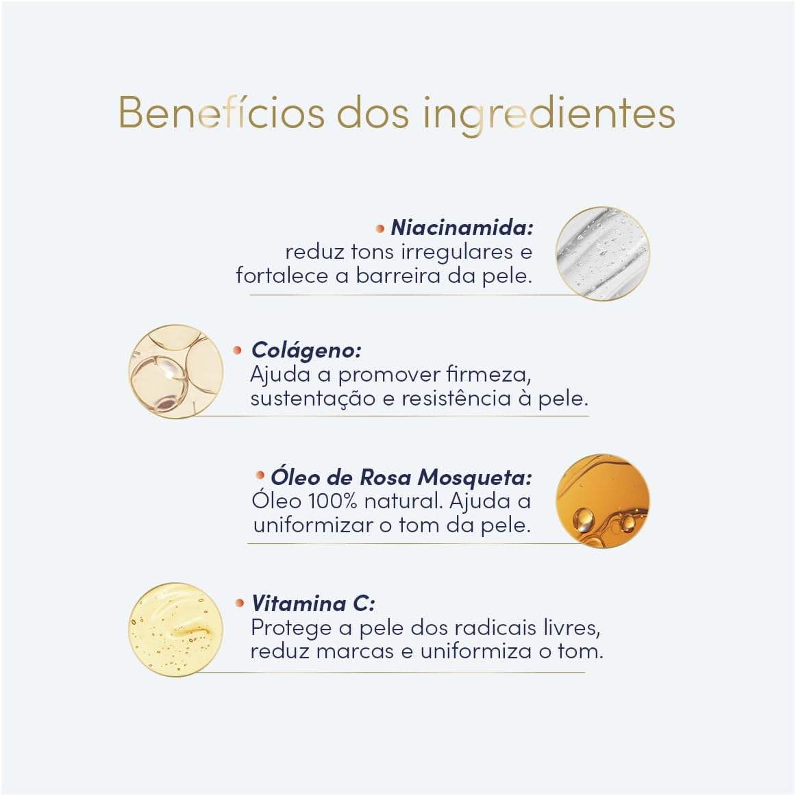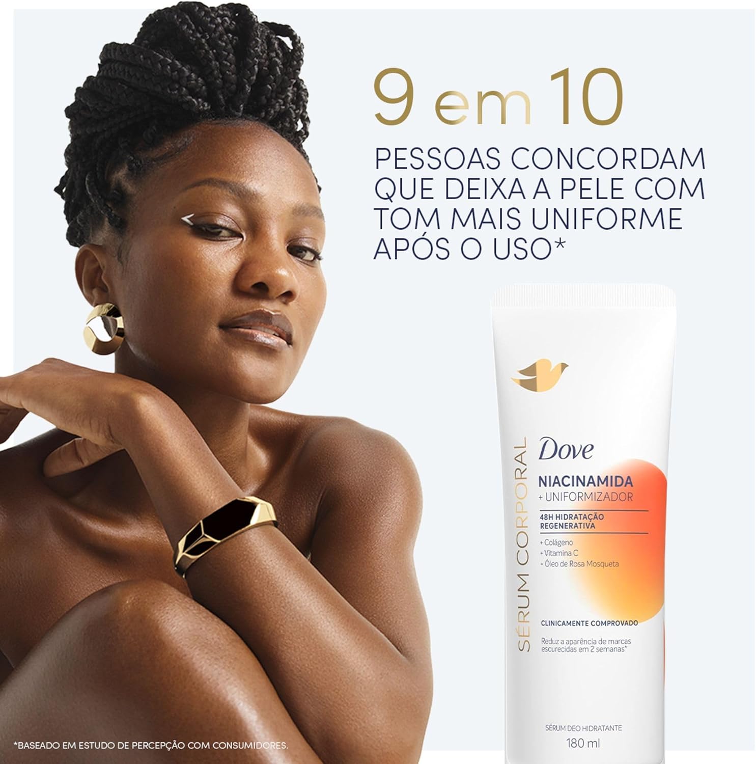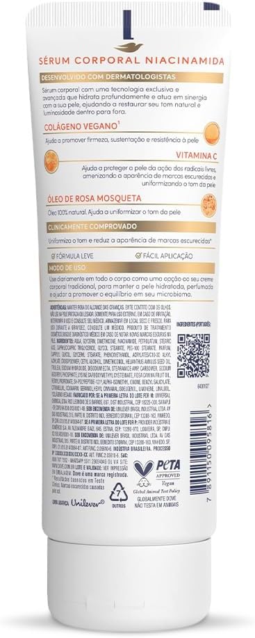 O novo Dove Sérum Hidratante Corporal Niacinamida, com efeito uniformizador, atua além da hidratação, ajudando a uniformizar o tom da pele e restaurar sua luminosidade natural. Este hidratante corporal oferece 48h de hidratação regenerativa com ativos de alta potência, como Colágeno Vegano*, que promove firmeza, sustentação e resistência à pele; Vitamina C, que auxilia na proteção contra radicais livres, amenizando a aparência de marcas escurecidas e ajudando a uniformizar o tom da pele; e Óleo de Rosa Mosqueta, um óleo 100% natural que também contribui para a uniformização da pele. Desenvolvido em parceria com dermatologistas e testado em mulheres reais, o Dove Sérum Hidratante Niacinamida possui uma tecnologia exclusiva e avançada que hidrata profundamente e atua em sinergia com sua pele, ajudando a restaurar seu tom natural e luminosidade de dentro para fora. Está clinicamente comprovado que o Sérum Hidratante Dove Niacinamida uniformiza o tom da pele e reduz a aparência de marcas escurecidas**. Sua fórmula leve e de fácil aplicação é indicada para peles com marcas escurecidas e ressecadas. Use diariamente em todo o corpo como alternativa ao seu creme corporal tradicional para manter a pele hidratada, perfumada e ajudar a promover o equilíbrio do microbioma da pele. Globalmente, Dove não testa seus produtos em animais. A linha de Séruns Deo Hidratantes Dove combina ativos de alta potência para oferecer o cuidado que sua pele necessita. Escolha o Dove Sérum Hidratante Corporal Niacinamida que melhor atende às necessidades da sua pele. Dove. Cuide-se. Proteja-se. Pela beleza sem padrões! *Colágeno de origem vegetal **Resultados baseados em Teste Clínico. Marcas escurecidas causadas pelo sol.