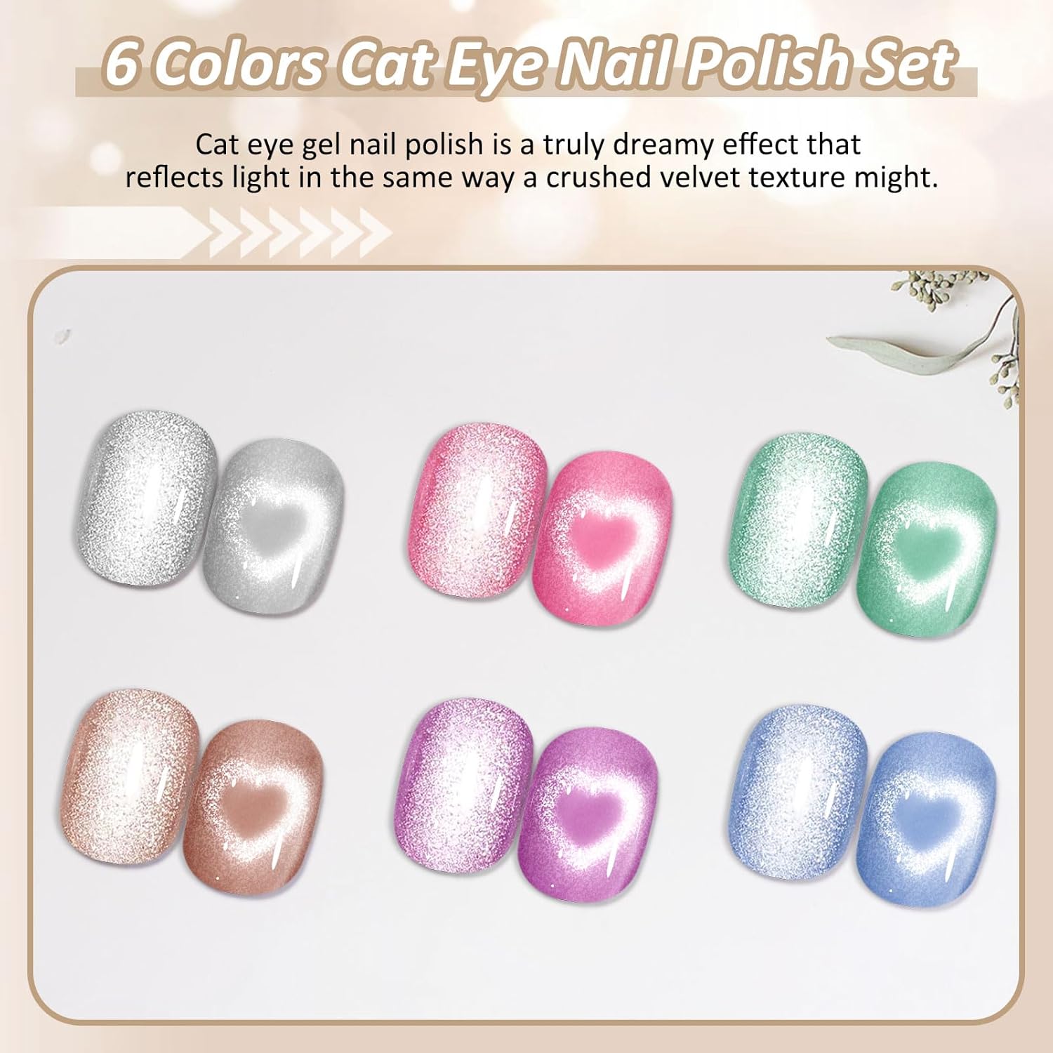Inclui: 6 x esmalte de gel olho de gato (7,5 ml cada) + 1 ímã