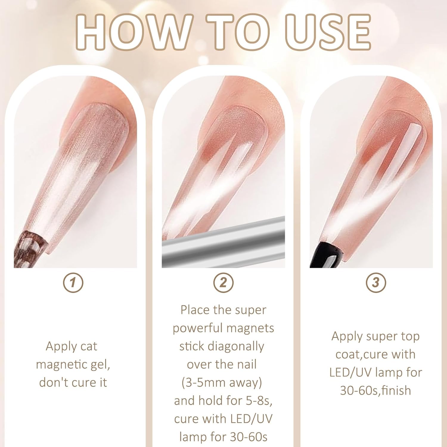 【Dicas de uso】 Antes de aplicar, faça um teste de adesivo. Nosso esmalte de gel cateye é seguro, mas projetado apenas para unhas. Para melhores resultados, aplique camadas finas e use o ímã imediatamente. Se o efeito magnético desaparecer, adicione outra camada e remagnetize. Guarde longe da luz solar para preser o brilho do esmalte de gel olho de gato!