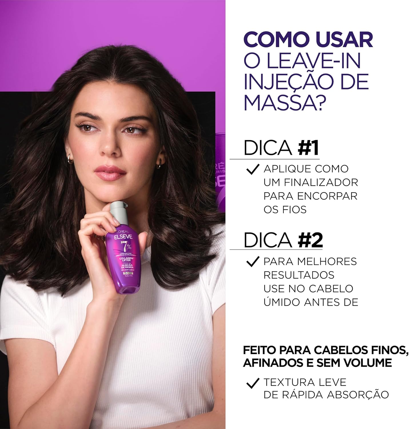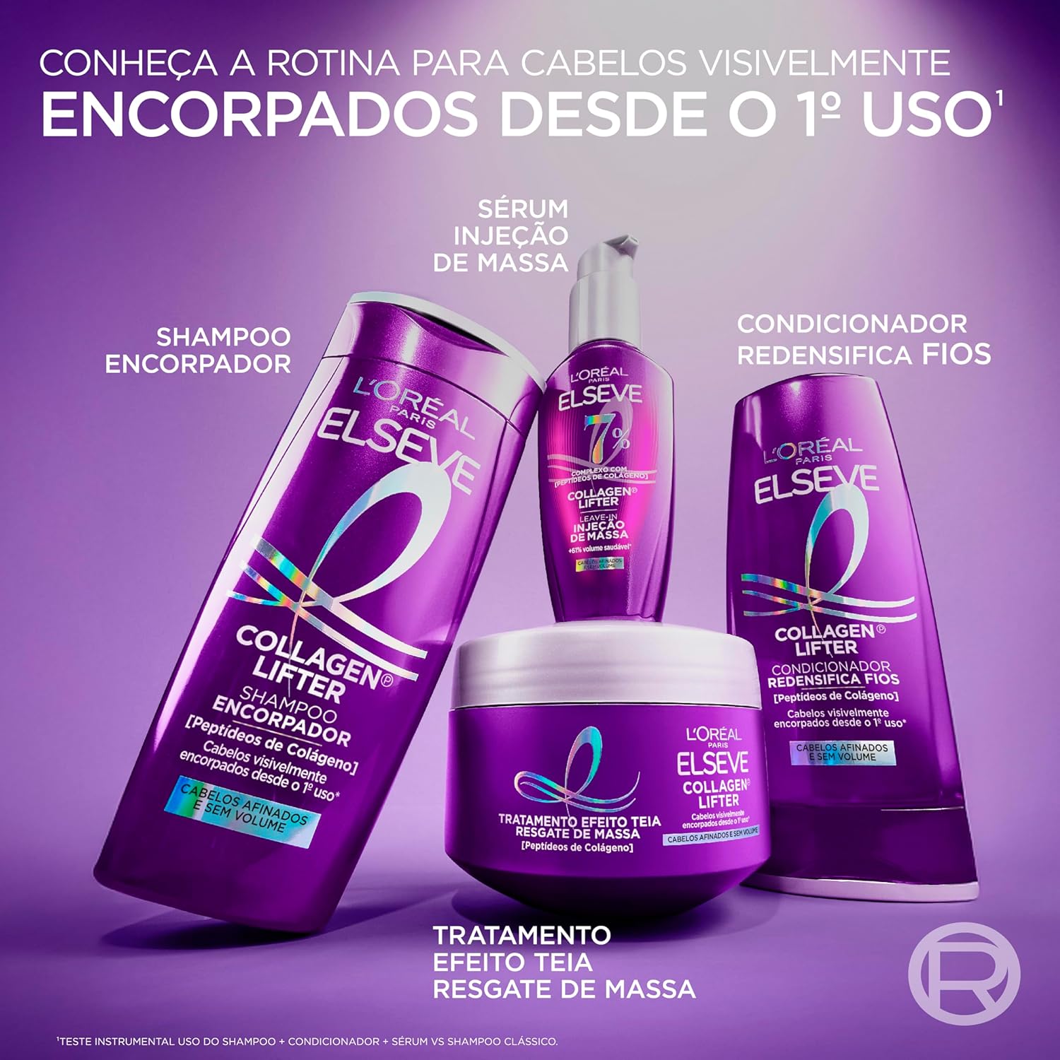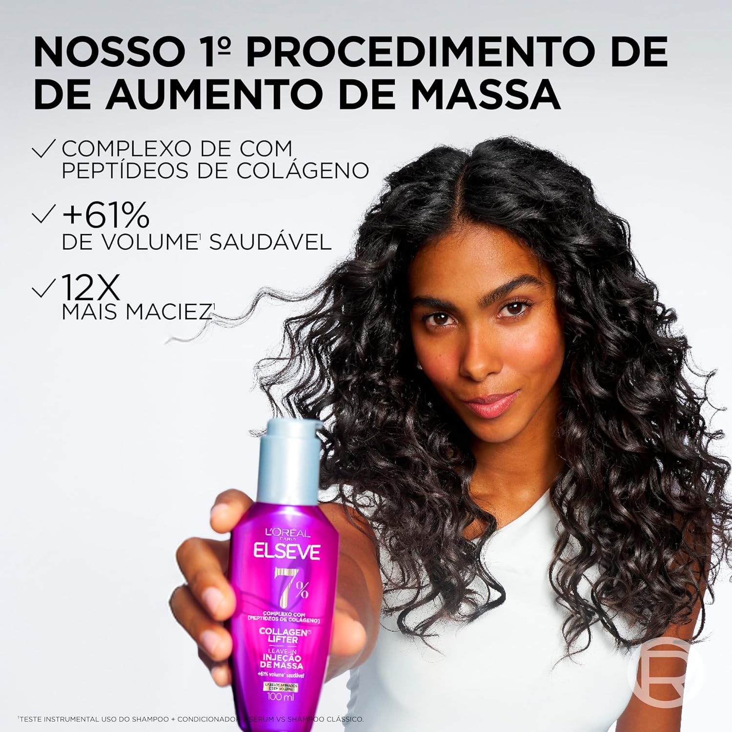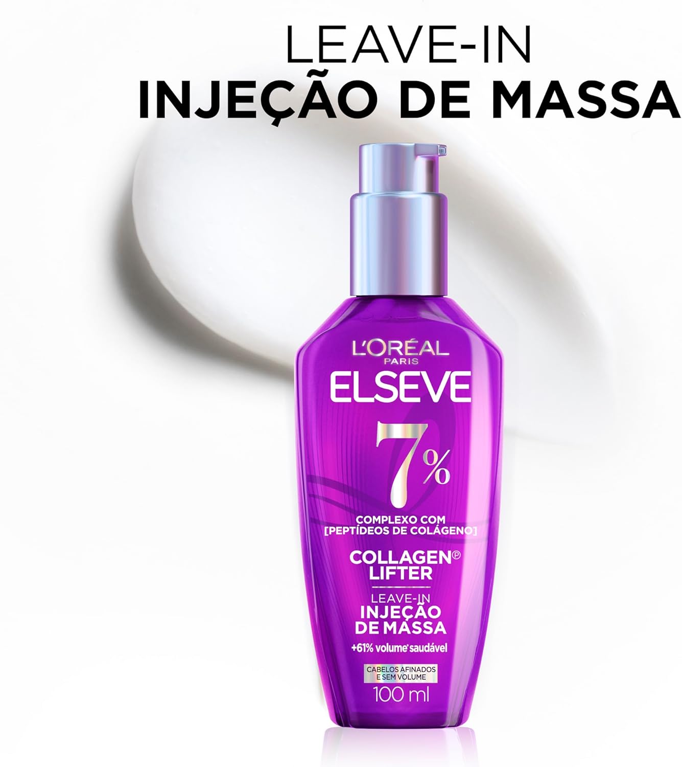 Conheça o Leave-in Elseve Collagen® Lifter Injeção de Massa. Desenvolvido para cabelos finos e sem volume, sua fórmula com Peptídeos de Colágeno vegetal fortalece os fios, proporcionando corpo, densidade e movimento desde o primeiro uso. Transforme seu cabelo com vitalidade e aparência saudável. O Leave-in Elseve Collagen® Lifter foi criado para solucionar a falta de volume e densidade em cabelos finos. Sua fórmula exclusiva é enriquecida com 7% de um complexo de Peptídeos de Colágeno vegetal, que reconstrói a massa capilar, e promove um aumento de até 61% no volume. Este leave-in fortalece a estrutura dos fios, garantindo um efeito duradouro por 72 horas, com raízes mais sustentadas e sem oleosidade. O resultado é um cabelo visivelmente mais encorpado, com movimento, vitalidade e uma aparência cheia e saudável desde a primeira aplicação. Adicione o Leave-in Elseve Collagen® Lifter à sua rotina e redescubra a densidade e a vitalidade dos seus fios!