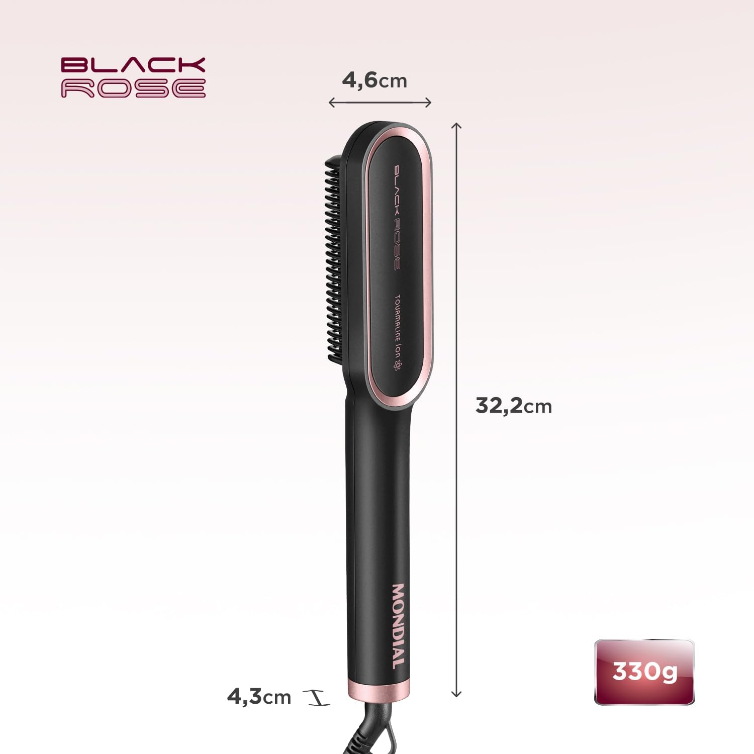 REVESTIMENTO CERÂMICO COM TOURMALINE ÍON A escova alisadora Mondial tem revestimento de cerâmica com Tourmaline Íon, tecnologia que libera íons e fecha a cutícula dos fios, deixando-os disciplinados, macios e com brilho intenso.
