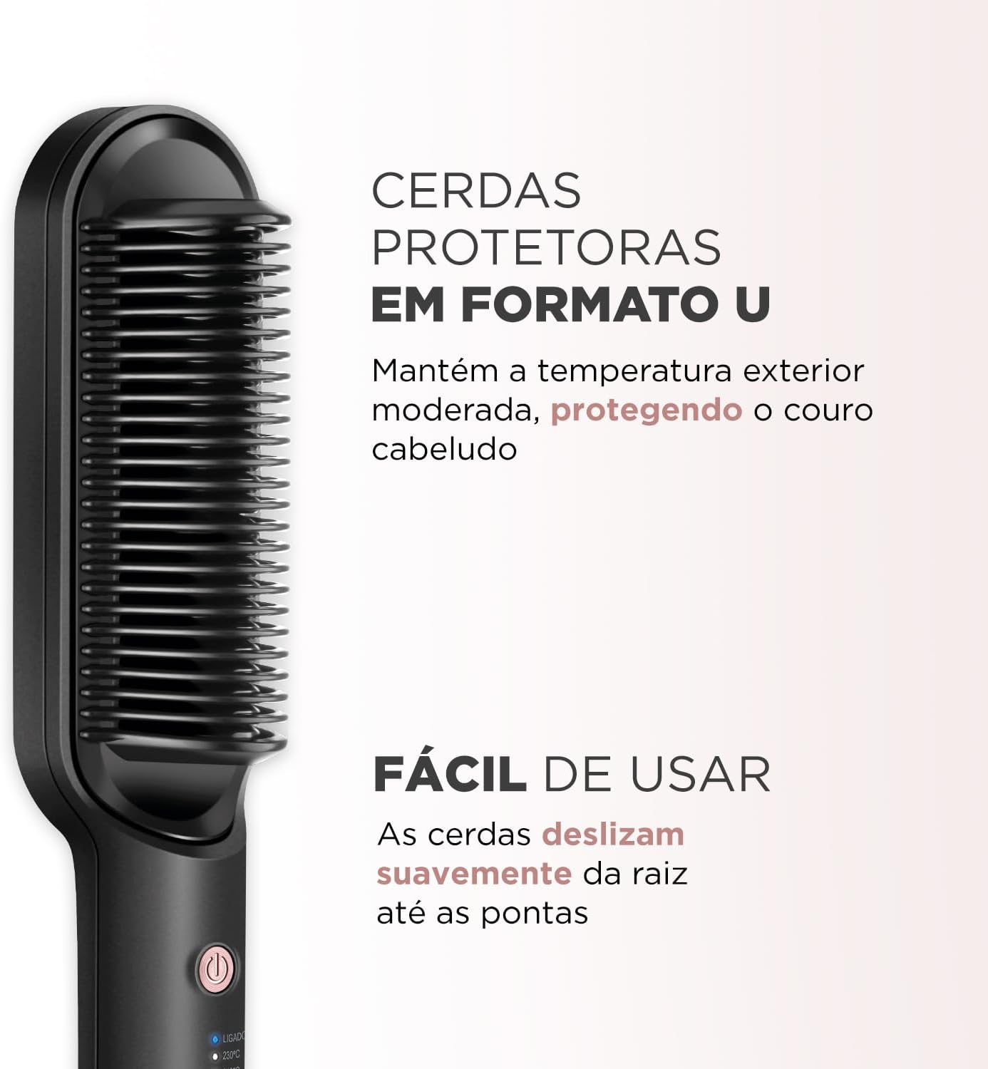 FÁCIL E PRÁTICO DE USAR: Selecione a temperatura, aguarde o aquecimento e deslize a escova pelas mechas. O liso é instantâneo;