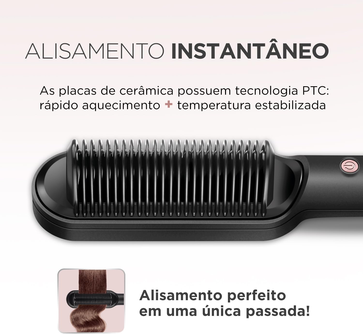 ALISAMENTO INSTANTÂNEO: As placas de cerâmica da Escova Alisadora possuem tecnologia de aquecimento PTC, que garante o alisamento em uma única passada;