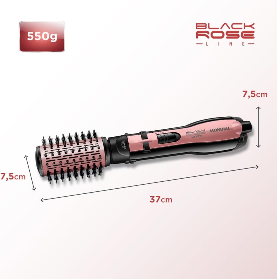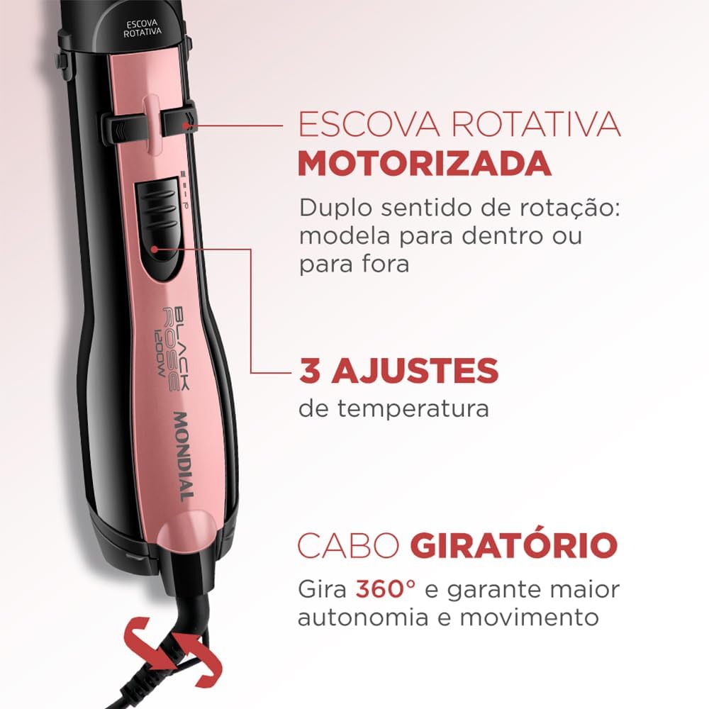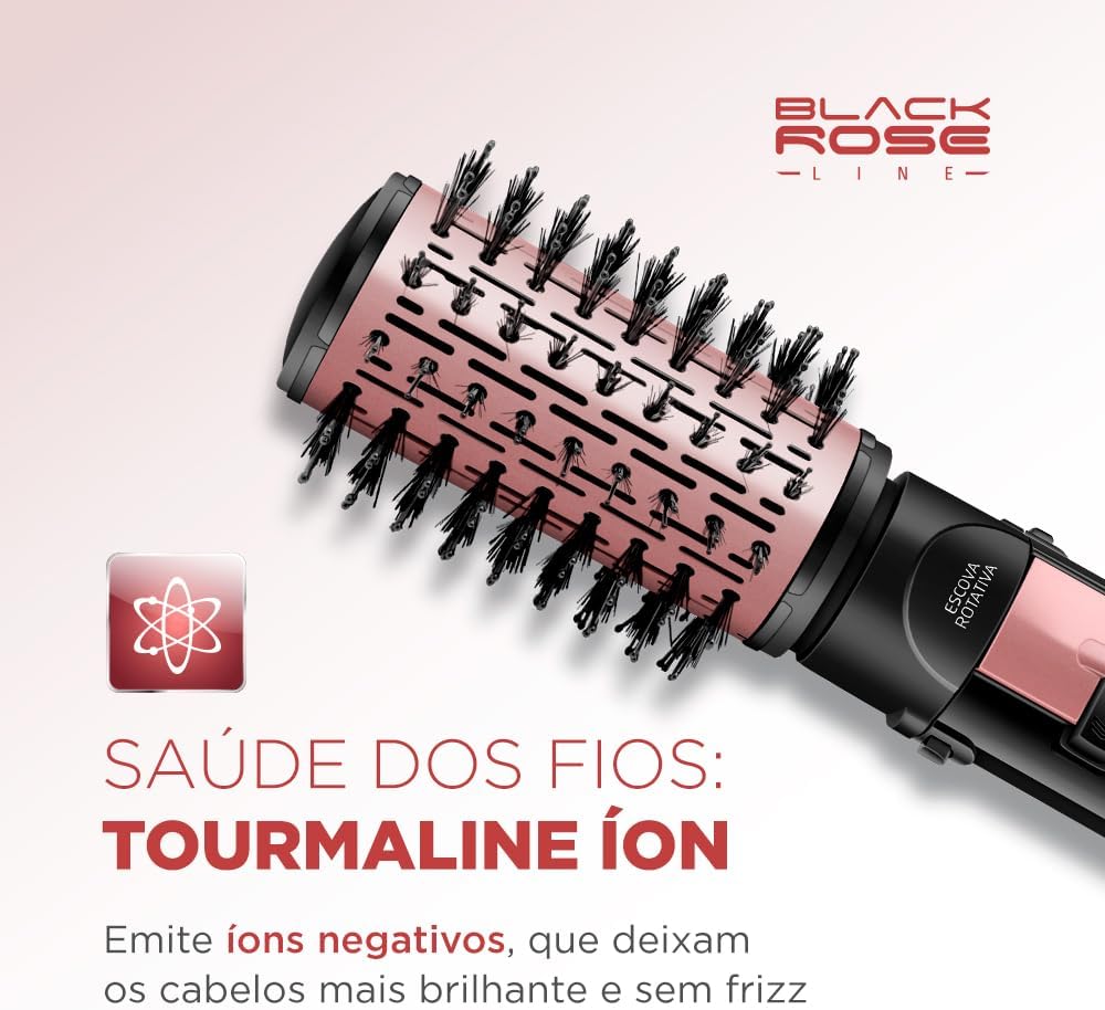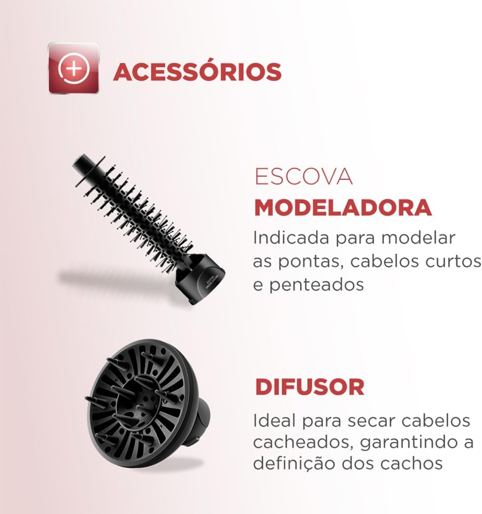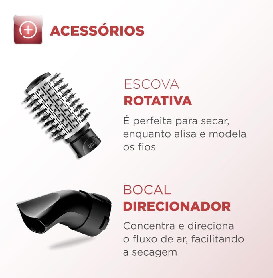 ESCOVA ROTATIVA MOTORIZADA: une o movimento rotativo da escovação com o calor do secador. E gira nos dois sentidos para modelar;