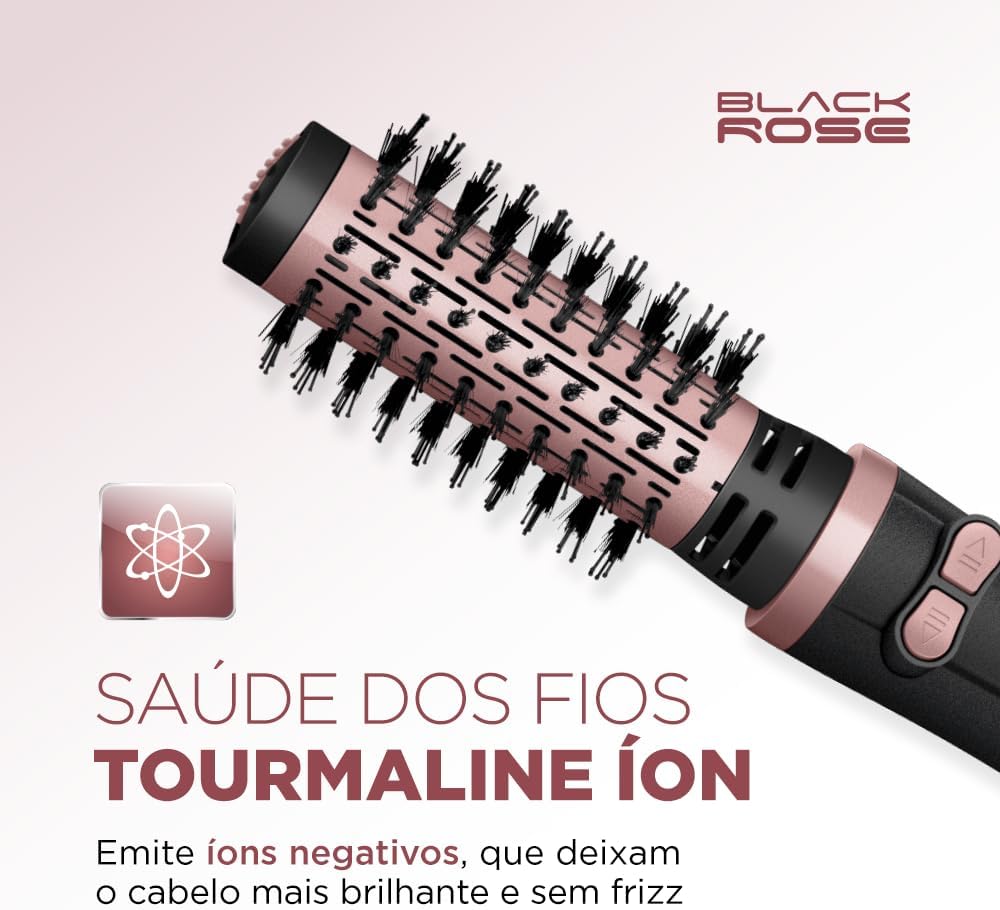 A escova rotativa Mondial Black Rose deixa sua rotina de beleza muito mais prática. Com ela, você seca, alisa e modela os cabelos usando apenas uma mão, simulando o efeito da escovação no salão. Possui revestimento cerâmico com Tourmaline Íon, que sela as cutículas e reduz o frizz, deixando os fios mais macios e brilhantes.