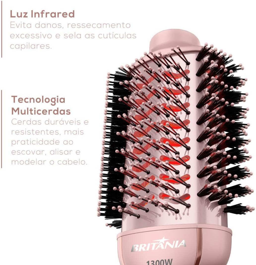 A Nova Linha de Cuidados Pessoais Viih Tube foi criada para acompanhar você em todos os momentos. Liberte a beleza que existe em você com a Escova Secadora Britânia Linha Viih Tube Nanocerâmica BES36. A tecnologia Infrared protege seus fios do calor excessivo, selando as cutículas e garantindo um cabelo brilhante, macio e livre de frizz. O revestimento em nanocerâmica cuida da saúde capilar, permitindo o uso em cabelos secos, úmidos ou molhados, sem danificar. Com a Escova Secadora 4 em 1 você pode secar, alisar, modelar e dar volume, afinal, ela se adapta a qualquer estilo e tipo de cabelo. As multicerdas facilitam o processo, oferecendo um acabamento impecável com menos esforço. Além disso, a função bivolt e as opções de 3 temperaturas e 2 velocidades tornam seu dia a dia mais prático, seja em casa ou durante viagens. Com a Escova Secadora Britânia Linha Viih Tube Nanocerâmica BES36, você tem o controle total sobre o seu visual. Sinta-se linda e confiante, expressando sua personalidade através do seu cabelo. Adquira agora a sua Escova Secadora e descubra o poder de ter o cabelo que você sempre quis!