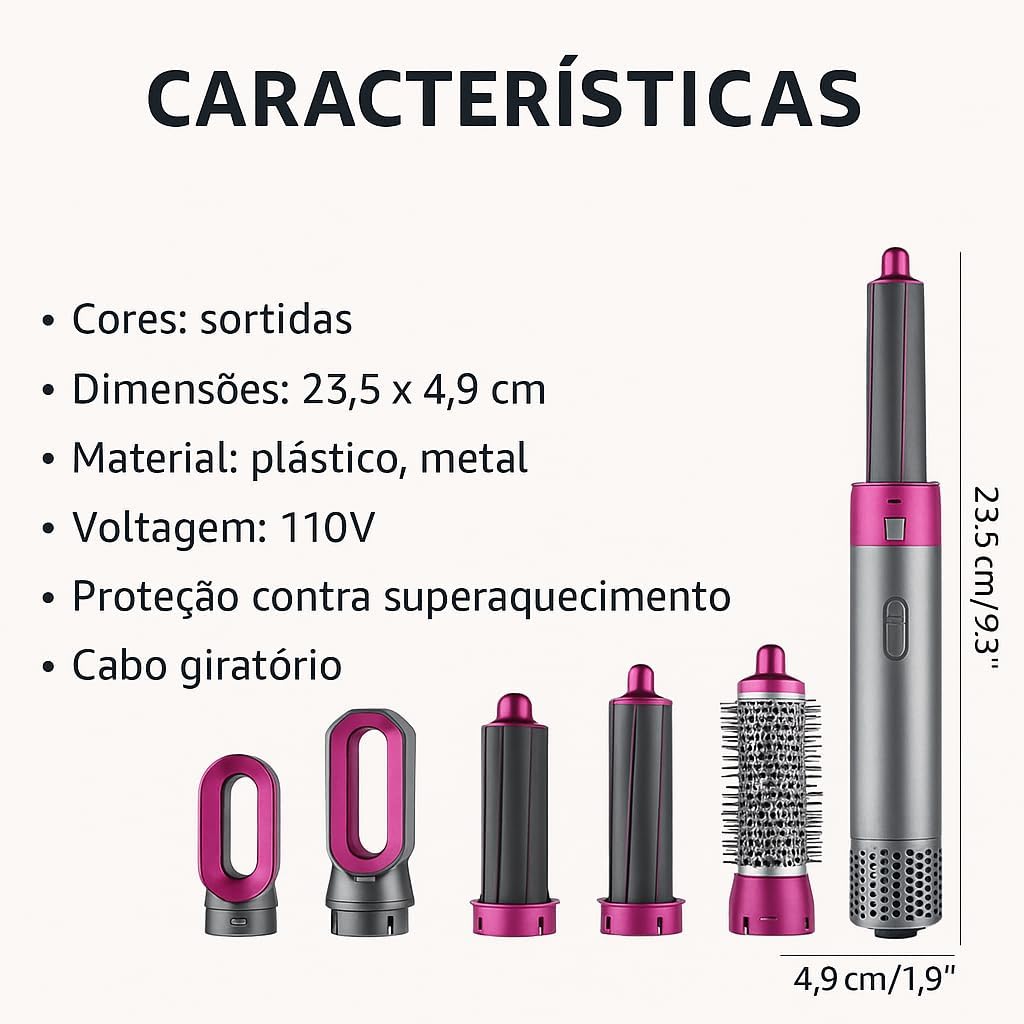 ✨ Kit Completo 5 em 1 – Inclui tubo de ar quente principal, cabeça de escova 54mm, escova modeladora 32mm e secador. Uma única ferramenta substitui prancha, babyliss e escova profissional.