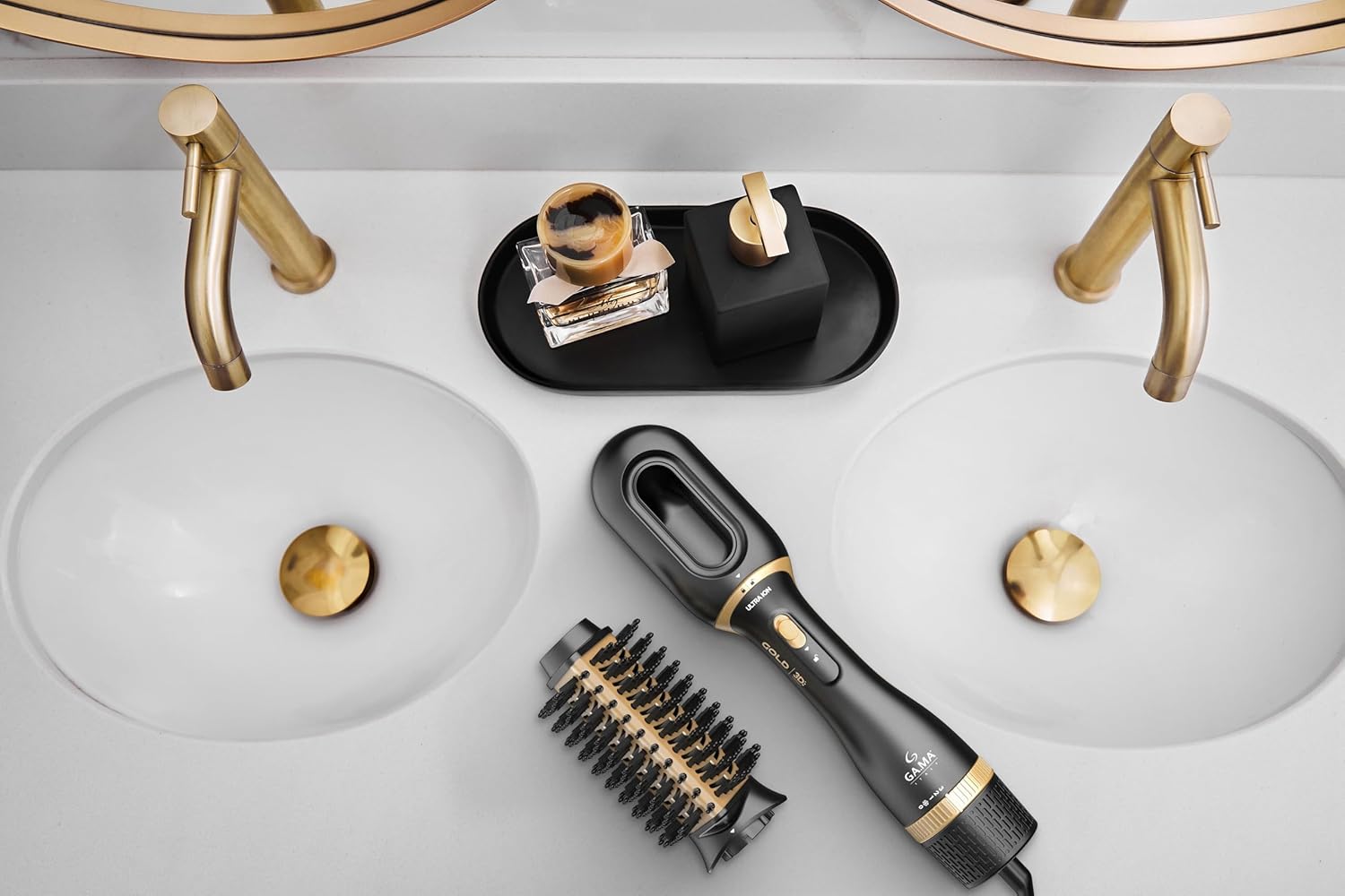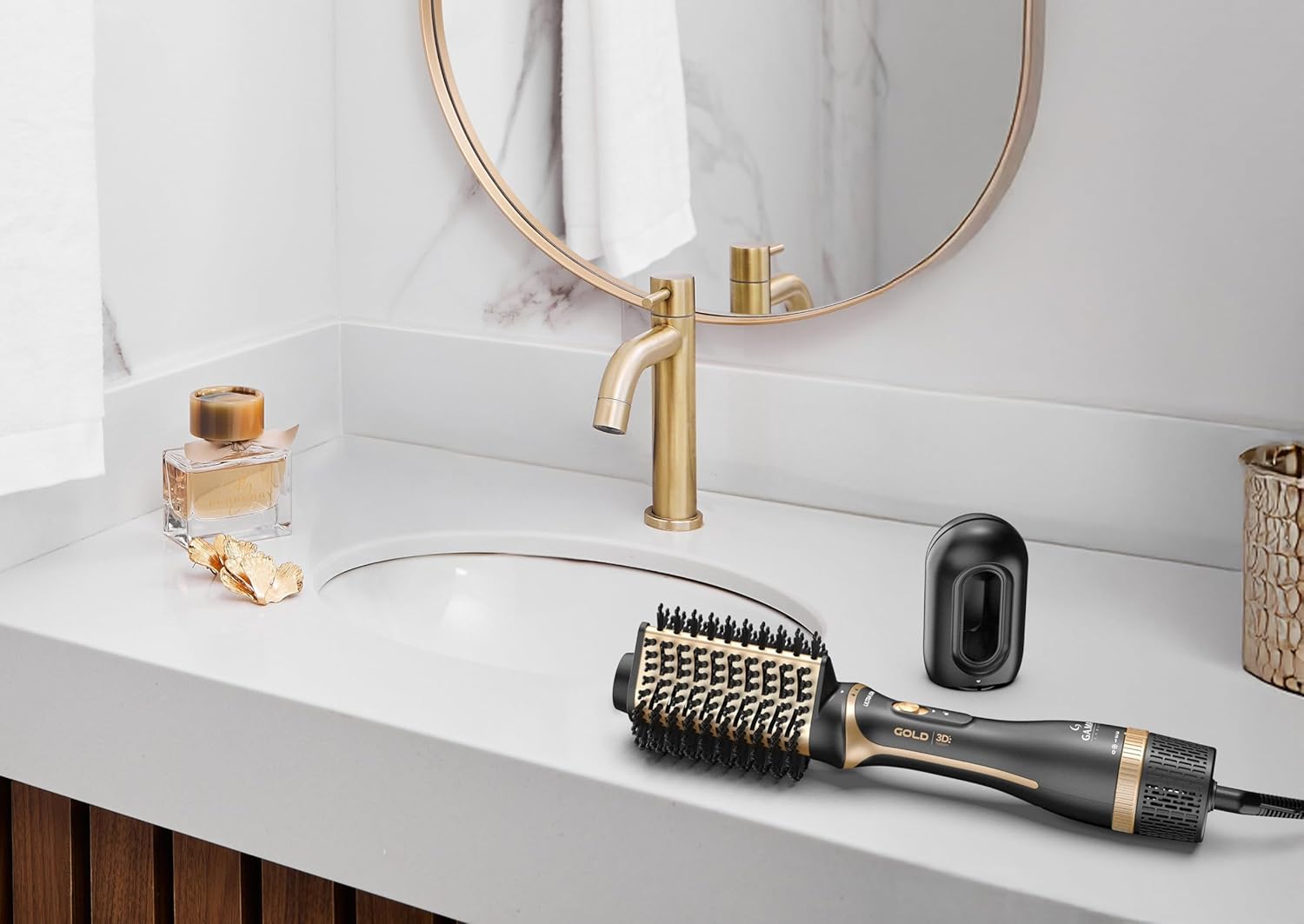 Transforme seus cabelos em instantes! Com a Escova Secadora Multicabeças Gold Ion 3D, você tem o poder de criar diversos estilos com um único produto. Seja para alisar, secar ou modelar seus cabelos, ela oferece versatilidade e praticidade, pois combina as funções de um secador e uma escova. Com a exclusiva tecnologia 3D Therapy e a tecnologia de Óleos essenciais, seus fios recebem um tratamento completo, ficando mais brilhantes, hidratados e protegidos. A tecnologia 3D Therapy proporciona 3 benefícios para o cabelo: brilho, antifrizz e reconstrução. A tecnologia de Óleos essenciais, presente no revestimento das escovas, deixa os cabelos muito mais sedosos e com aspecto saudável. Ela é ativada com o calor do produto, que nesta versão traz o óleo de argan. Muito conhecido como o ouro líquido entre os profissionais cabeleireiros, o óleo de argan é rico em ácidos graxos, ômega 9 e vitamina E, sendo assim um antioxidante poderoso, que promove hidratação e nutrição profunda para os fios, combate o envelhecimento e protege dos efeitos negativos do calor. Cabeças intercambiáveis Ela possui 2 cabeças intercambiáveis, que proporcionam versatilidade e praticidade onde você for. Cabeça secadora: Permite secar o cabelo antes de começar a modelá-lo. Cabeça em gota: Seu formato permite alcançar a raiz do cabelo para esco, modelar e dar volume em toda a extensão do fio. Alisa, modela e dá volume. Cerdas mistas e duplas Combinação perfeita para uma escovação eficaz e rápida, com a durabilidade que você precisa para usar sua escova por muito mais tempo. A escova é bivolt; basta escolher a tensão desejada, mudar a chave seletora, ligar na tomada e aproveitar tudo que ela tem a oferecer. Conta com 1.200W de potência, 3 níveis de velocidade e 2 de temperatura e jato de ar frio. Seu cabo giratório oferece maior liberdade de movimento durante o uso.