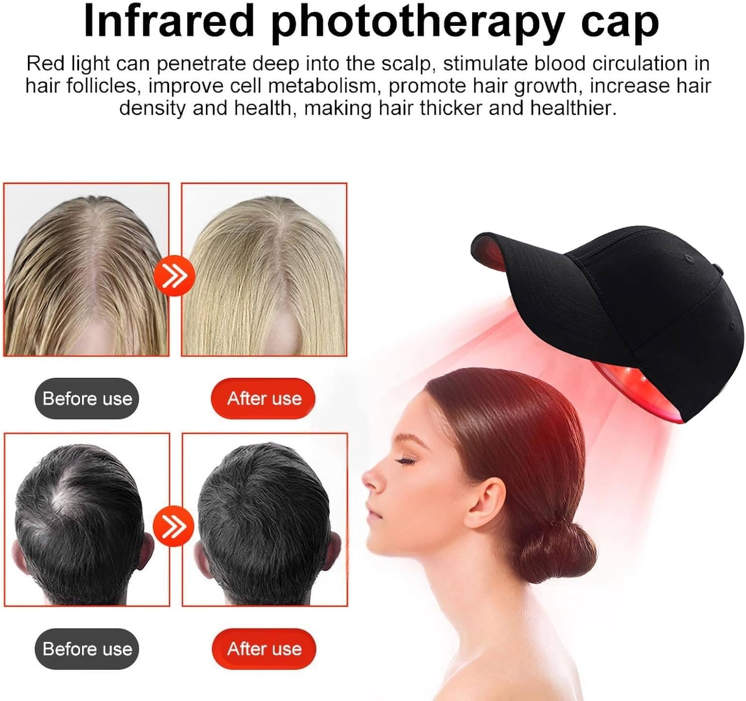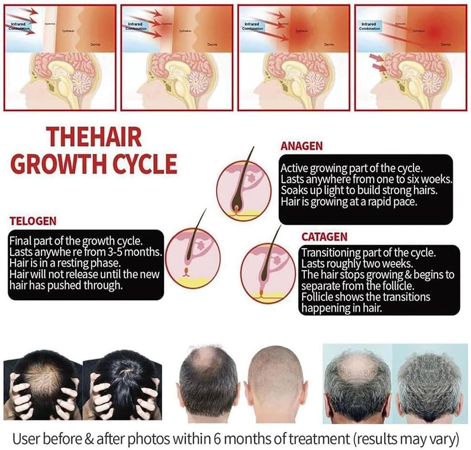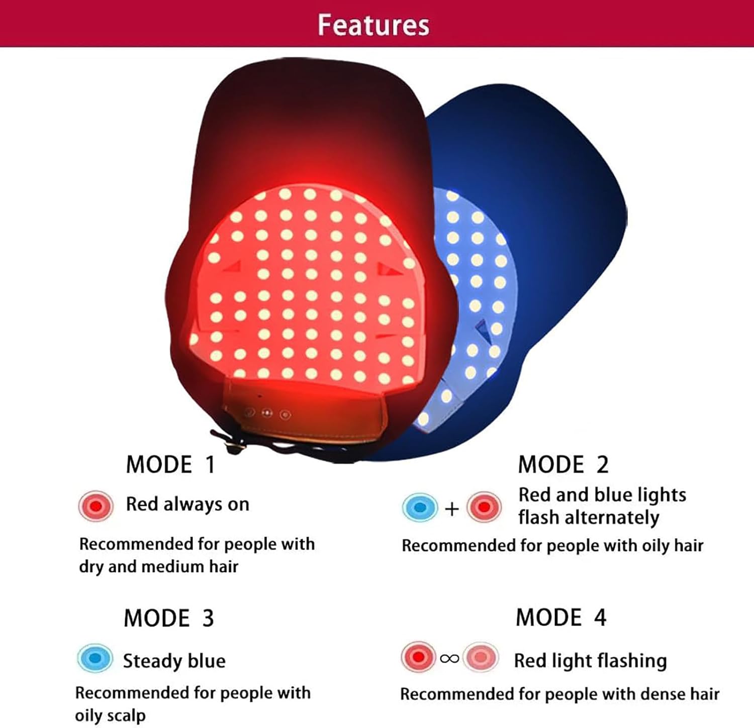 Crescimento do cabelo: adote 70 pérolas de lâmpada LED e os comprimentos de onda da luz são 630 nm/650 nm/470 nm luz vermelha e luz azul. A luz vermelha pode promover o metabolismo da pele e proteger os cabelos; a luz azul acalma a pele, promove o crescimento do folículo piloso e protege o couro cabeludo.