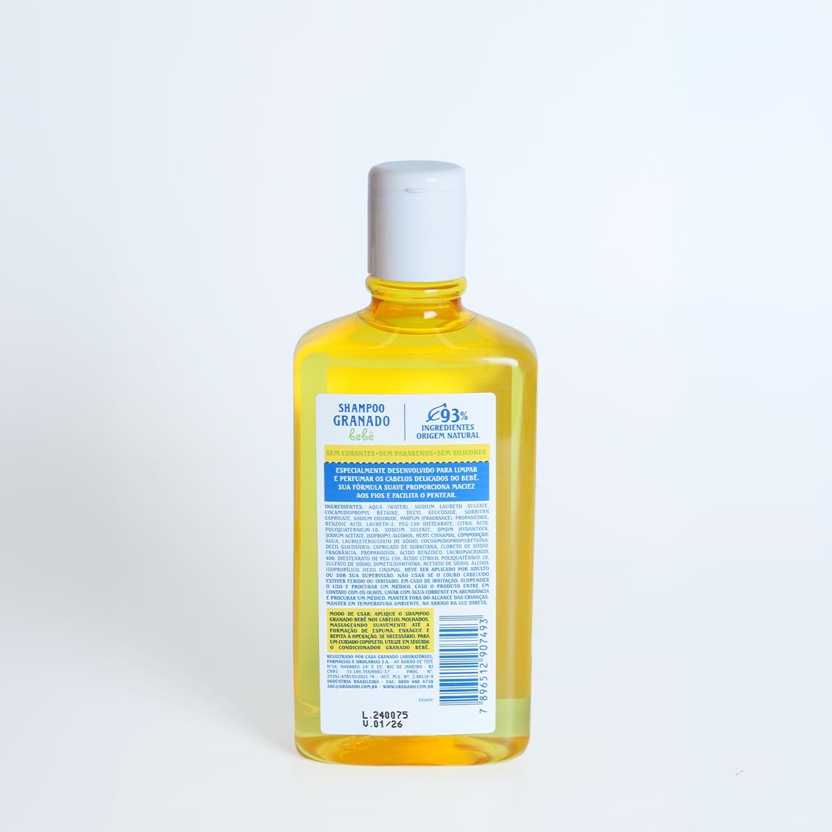 Modo usar: aplique o Shampoo Granado Bebê nos cabelos molhados, massageando suavemente até a formação de espuma. Enxágue abundantemente e repita a operação, se necessário.