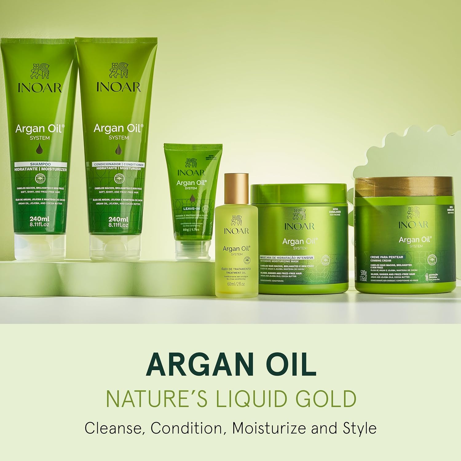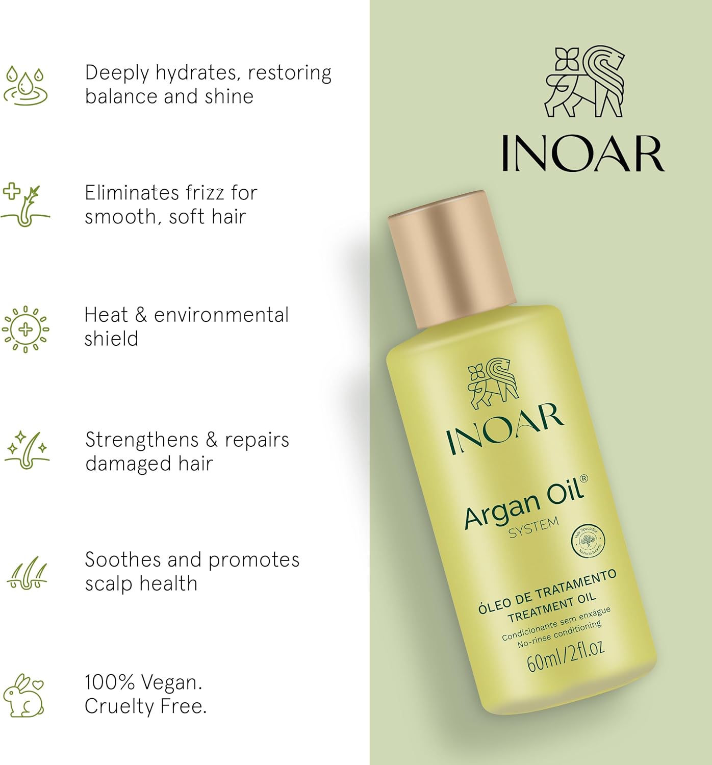 O Óleo de Argan da Inoar é um dos maiores clássicos da marca – e não é por acaso. Com uma fórmula rica em vitaminas A, C, E, antioxidantes e ácidos graxos, esse tratamento nutritivo proporciona brilho instantâneo, maciez e hidratação profunda, enquanto disciplina os fios e reduz o frizz. Seu uso é extremamente versátil: pode ser aplicado como finalizador, protetor térmico, óleo de umectação ou até misturado a máscaras e cremes para potencializar os resultados. A textura leve garante absorção rápida sem deixar os fios pesados ou oleosos. Ideal para todos os tipos de cabelo – especialmente os secos, danificados ou com frizz –, é o toque de ouro que transforma qualquer rotina de cuidados capilares.