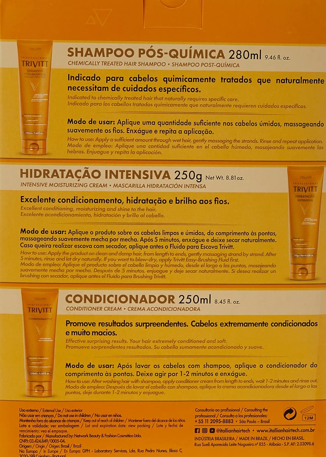 Aplique o Shampoo no cabelo úmido e massageie os fios de forma suave. Enxágue e repita a operação. Aplique o Condicionador do comprimento às pontas. Deixe agir por alguns minutos e enxágue. Aplique a Hidratação Intensiva sobre os cabelos limpos e úmidos, do comprimento às pontas, massageando suavemente mecha por mecha. Após 5 minutos, enxágue e deixe secar naturalmente. Caso queira realizar escova com secador, aplique antes o Fluido para Escova Trivitt.