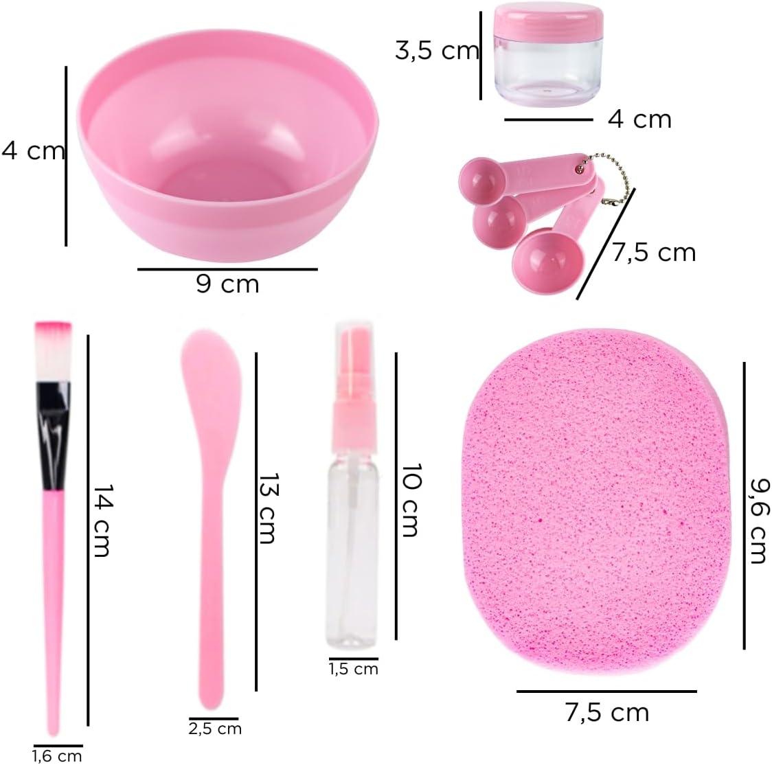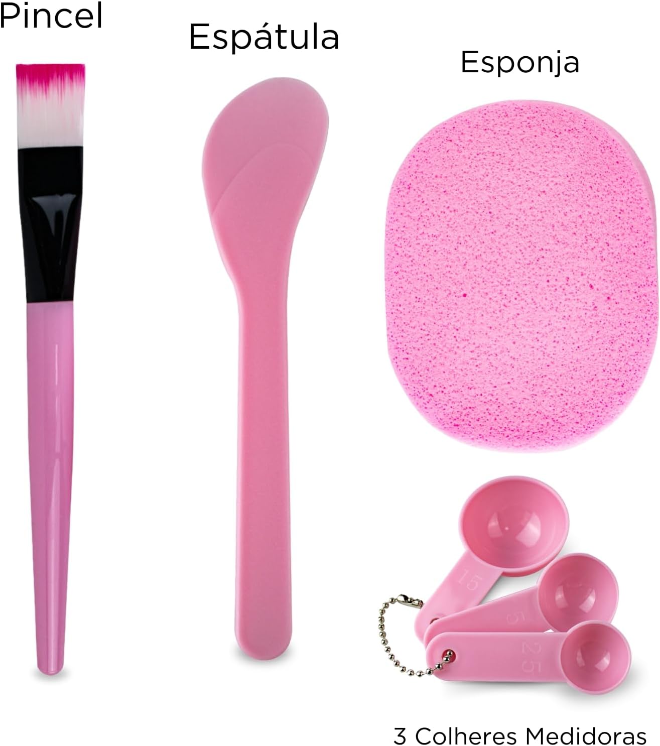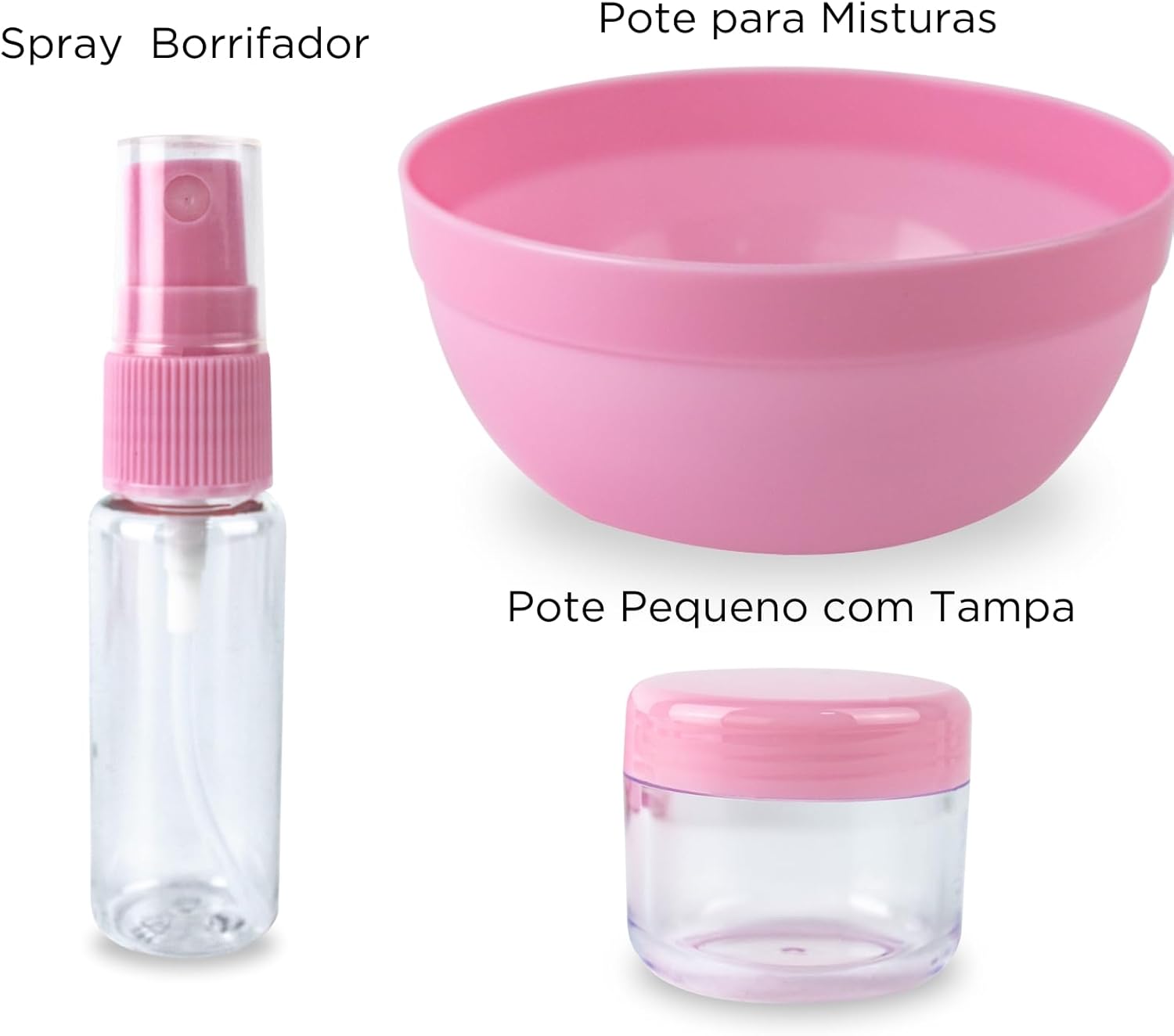 Contém: 03 – Colheres Medidoras 01 – Esponja 01 – Espátula 01 – Mini Borrifador 01 – Pincel 01 – Pote Pequeno com Tampa 01 – Pote para Misturas O Kit de Skin Care Rosa foi projetado para tornar sua rotina de cuidados com a pele mais prática e eficiente, desenvolvido pensando na aplicação e preparação da argila que trás diversos benefícios para o rosto. Cada item no kit tem uma função específica que facilita o processo de preparação, aplicação e remoção de máscaras de argila, além de outras etapas do cuidado facial. Pincel: Utilizado para aplicar a máscara de argila uniformemente no rosto, o pincel evita o contato direto com as mãos, garantindo uma aplicação precisa e higiênica, sem desperdício de produto.
