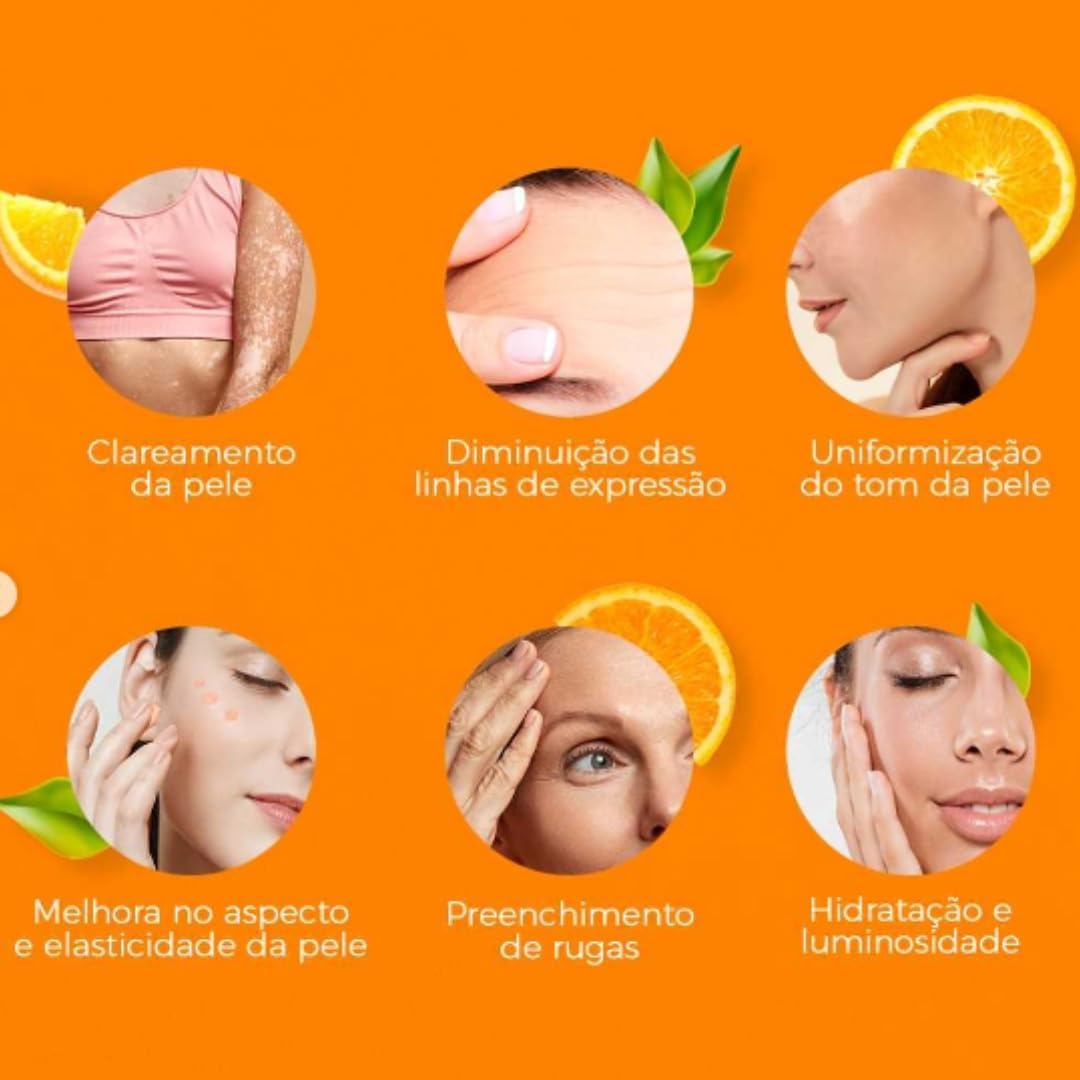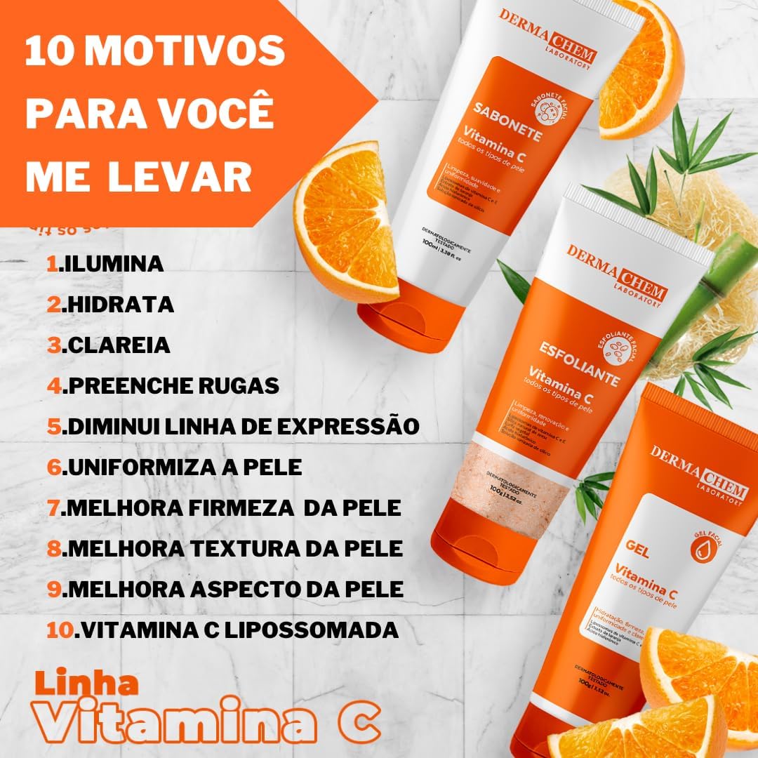 KIT SKINCARE VITAMINA C ANTI IDADE E CLAREADOR DERMACHEM+ SERUM CLAREADOR. *Com teste de eficácia comprovada!*+Protetor Solar Sem Cor FPS60+Mousse Micelar Vitamina C Rhenuks VOCÊ NÃO PRECISA PAGAR CARO EM SKINCARE, NOS AJUDAMOS VOCÊ COM O MELHOR PRODUTO COMPLETO E CUSTO BENEFICIO. CONTÉM: 1 SABONETE 100ML 1 ESFOLIANTE 100ML 1 GEL HIDRATANTE 100 ML 1 SERUM CLAREADOR 30ML 1 PROTETOR SOLAR 40G DERMACHEM Sem Cor FPS60 1 MOUSSE MICELAR ESPUMA DE LIMPEZA 150 ML VITAMINA C RHENUKS (TODOS OS TIPOS DE PELE) 1.O SABONETE VITAMINA C DERMACHEM LABORATORY proporciona limpeza, suavidade e uniformidade da pele. Para melhores resultados, utilize a linha completa VITAMINA C DERMACHEM LABORATORY. MODO DE USO: Aplicar duas vezes ao dia, uma de manhã e outra à noite, ou quando sentir necessidade da limpeza facial. No rosto previamente umedecido, fazer movimentos circulares. Enxaguar com água em abundância. 2.O GEL ESFOLIANTE VITAMINA C DERMACHEM LABORATORY, proporciona limpeza, renovação e uniformidade da pele. Garante uma esfoliação natural sem agredir. Para melhores resultados, utilize a linha completa VITAMINA C DERMACHEM LABORATORY. MODO DE USO: Utilize de 1 a 2 vezes por semana ou quando sentir necessidade. Aplique no rosto previamente umedecido em movimentos circulares. Aguarde 5 minutos e depois enxágue com água em abundância. 3.O GEL ANTI-IDADE VITAMINA C DERMACHEM LABORATORY, proporciona hidratação, firmeza, uniformidade e clareamento da pele. Melhora o preenchimento das rugas. Para melhores resultados, utilize a linha completa VITAMINA C DERMACHEM LABORATORY. MODO DE USO: Utilize 2 vezes ao dia, de manhã e à noite ou quando sentir necessidade. De manhã após aplicação do gel é recomendável utilizar o PROTETOR SOLAR FACIAL DERMACHEM. Aplique no rosto limpo em movimentos circulares, até a absorção completa do produto. Não enxaguar. 4.O Sérum Clareador Dermachem Laboratory foi desenvolvido com associação de Niacinamida, ácido mandélico, ácido hialurônico e Íons silício que promovem clareamento de Melasma e uniformidade da pele. Além disso, tem ação antirrugas e previne envelhecimento precoce. O resultado é uma pele incrível, radiante e viçosa. MODO DE USO: ROTINA DIURNA: 1º PASSO: Pela manhã, limpe bem o rosto com o sabonete de limpeza da Linha DERMACHEM. 2º PASSO: Aplique de 1-2 gotas do Sérum no rosto, pescoço e colo. Faça uma massagem com movimentos circulares para melhor absorção do produto. 3º PASSO: Aplique o protetor solar de sua preferência. 4º PASSO: Ao longo do dia repita esse cuidado. ROTINA NOTURNA: Á noite, com a pele limpa e seca aplique novamente o Sérum. Utilize o Sérum 3x ao dia. Não enxaguar. PRECAUÇÕES Evitar contato com os olhos. Em caso de contato com os olhos, la com água em abundância. Se houver irritação suspenda o uso. Mantenha o produto fora do alcance de crianças. Não ingerir. Uso externo. Não aplicar nas pálpebras, nos cantos externos do nariz e da boca e na pele irritada ou lesionada. Evitar exposição solar durante o uso do produto. Durante a primeira semana de uso, aplicar pequenas quantidades de produto, em dias alternados. Conservação: Conser em temperatura ambiente. Proteger da luz, do calor e da umidade em excesso. Recomendações Importantes: Nas primeiras aplicações poderão ser observadas sensações transitórias de ardor, pinicação ou ressecamento da pele. Persistindo o incômodo, suspenda o uso do produto e procure orientação médica. Com teste de eficácia comprovada!