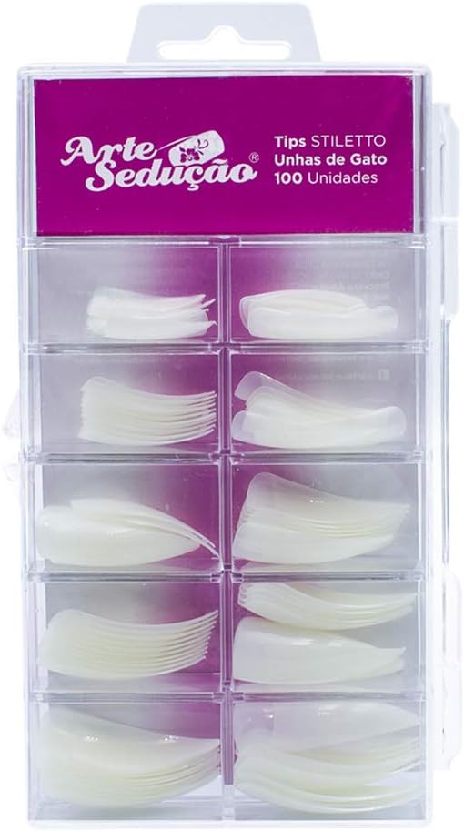 Contém 1 caixinha com 100 unidades de Tips Postiças + 1 Cola para Unhas 3g + 1 Alicate Cortador de Unhas Tips Postiças (Cor de acordo com a disponibilidade) + 1 Lixa Bumerangue Lavável Arte Sedução