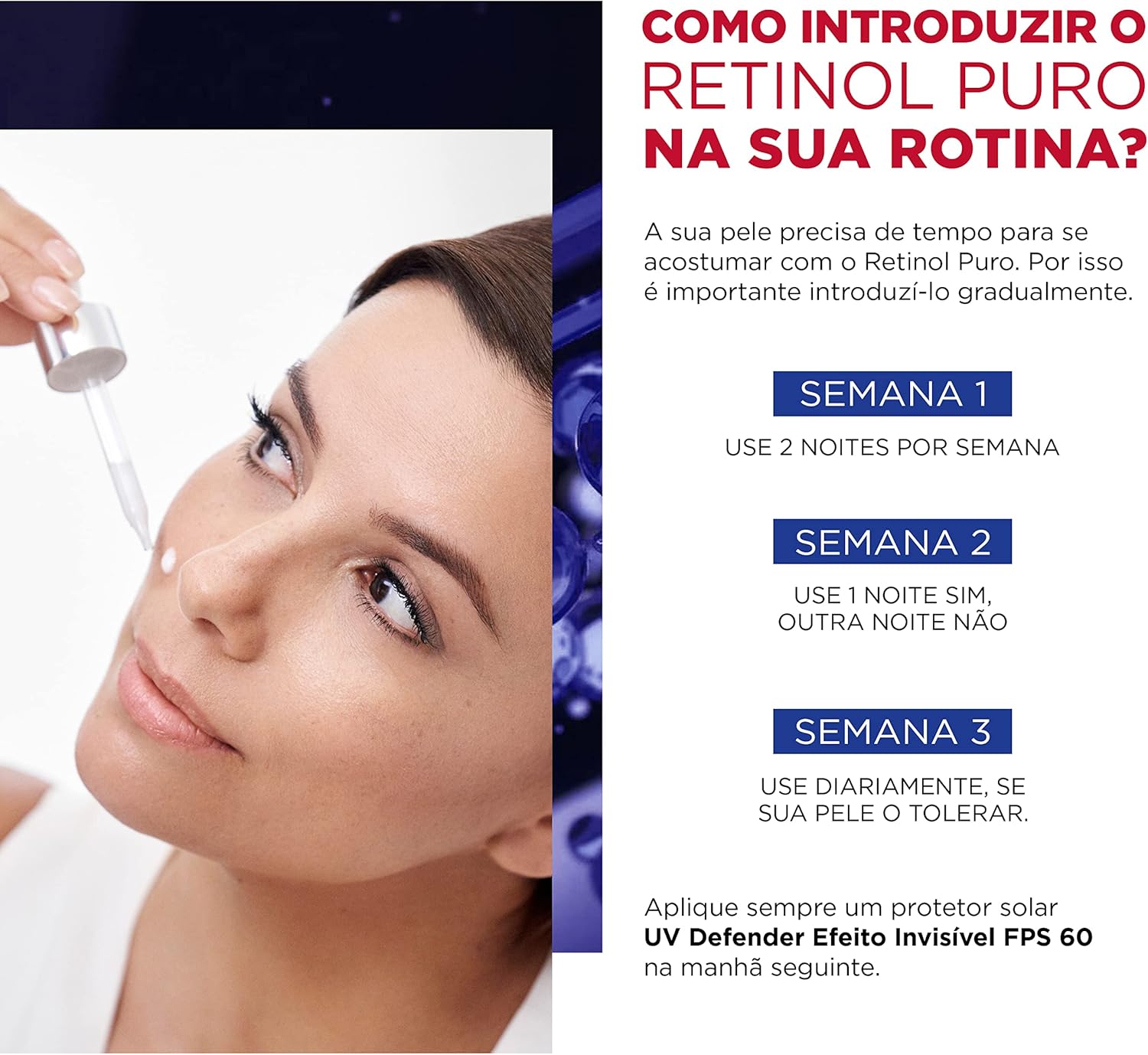 Aplique em noites intercaladas sobre a pele limpa e seca, antes do hidratante, para ajudar sua pele a se adaptar ao retinol e potencializar os resultados.