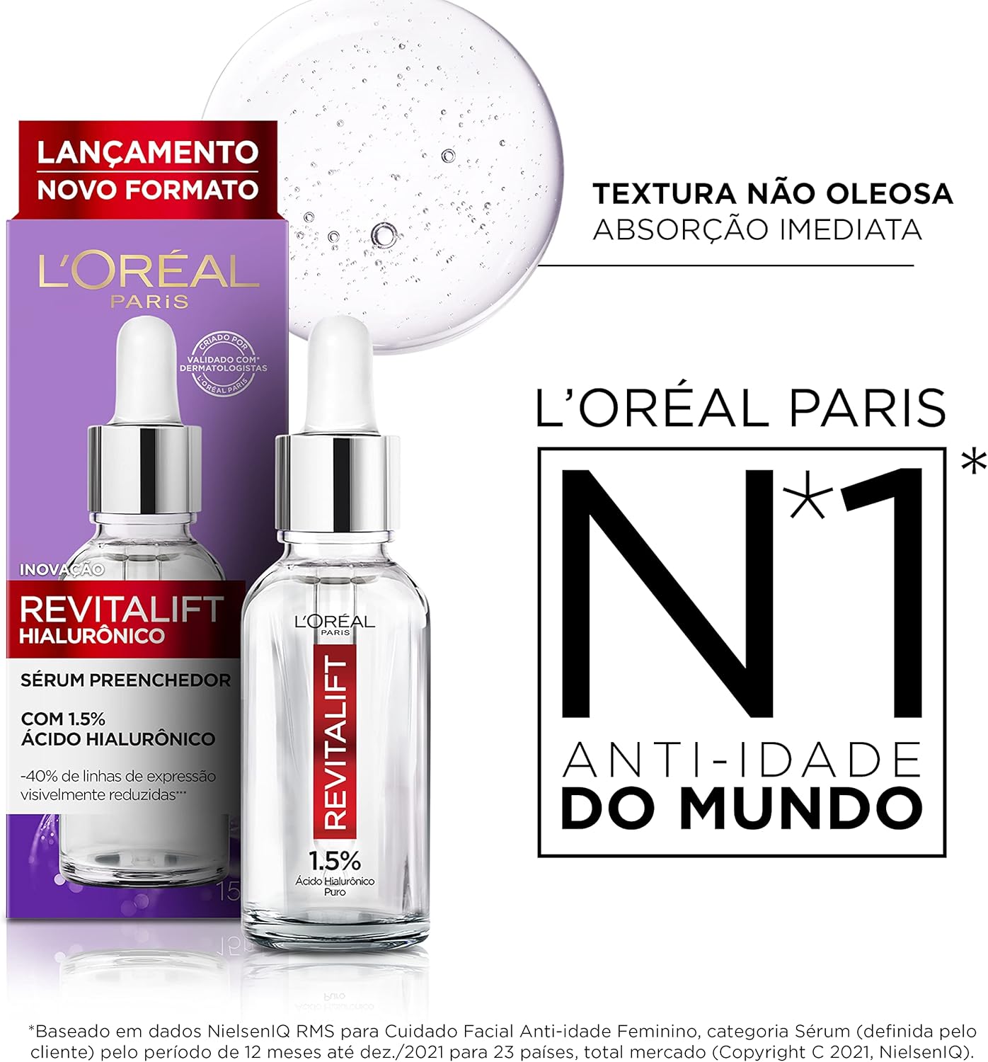 O Sérum Preenchedor Revitalift Hialurônico da L’Oréal Paris é um sérum anti-idade com ação preenchedora e uma poderosa ação hidratante. Sua fórmula possui uma rápida absorção, sem sensação oleosa e não obstrui os poros. Com 1,5% de ácido Hialurônico, este sérum não apenas hidrata intensamente a pele, mas também reduz até 40% das linhas de expressão em até 4 semanas. Testado com dermatologistas, o novo Sérum Preenchedor Revitalift Hialurônico é indicado para todos os tipos de pele e é adequado também para peles sensíveis.