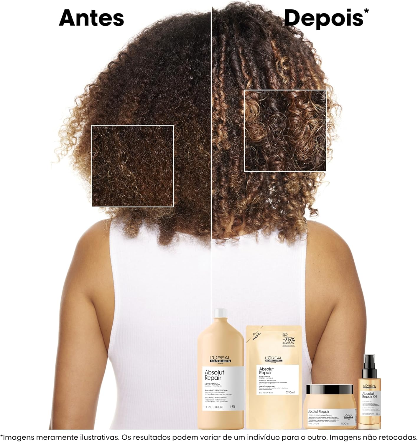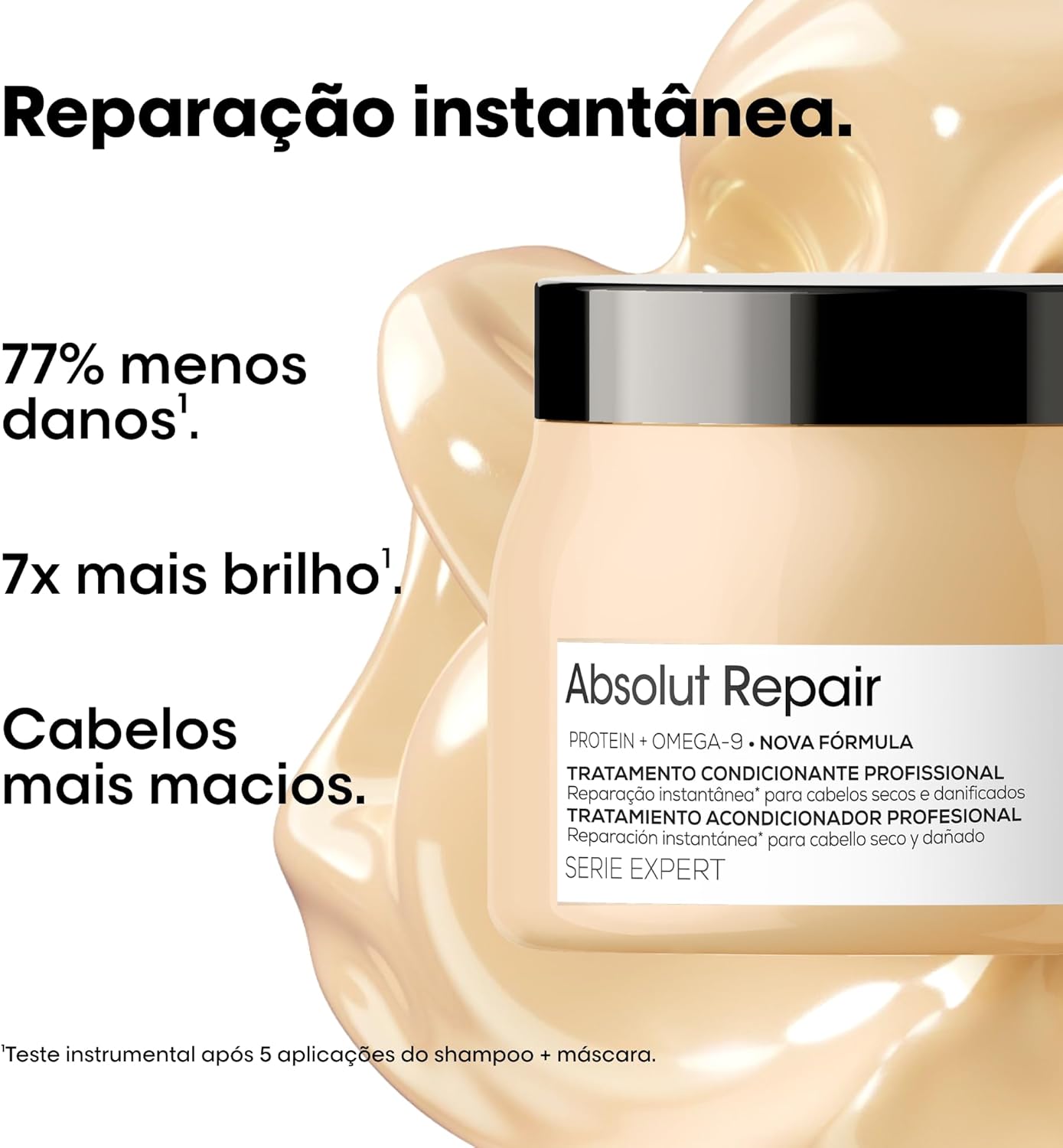 Absolut Repair repara instantaneamente os fios, trazendo maciez e brilho, sem pesar. Está comprovado que reduz os danos em até 77%* e deixa o cabelo 7x** mais brilhante.