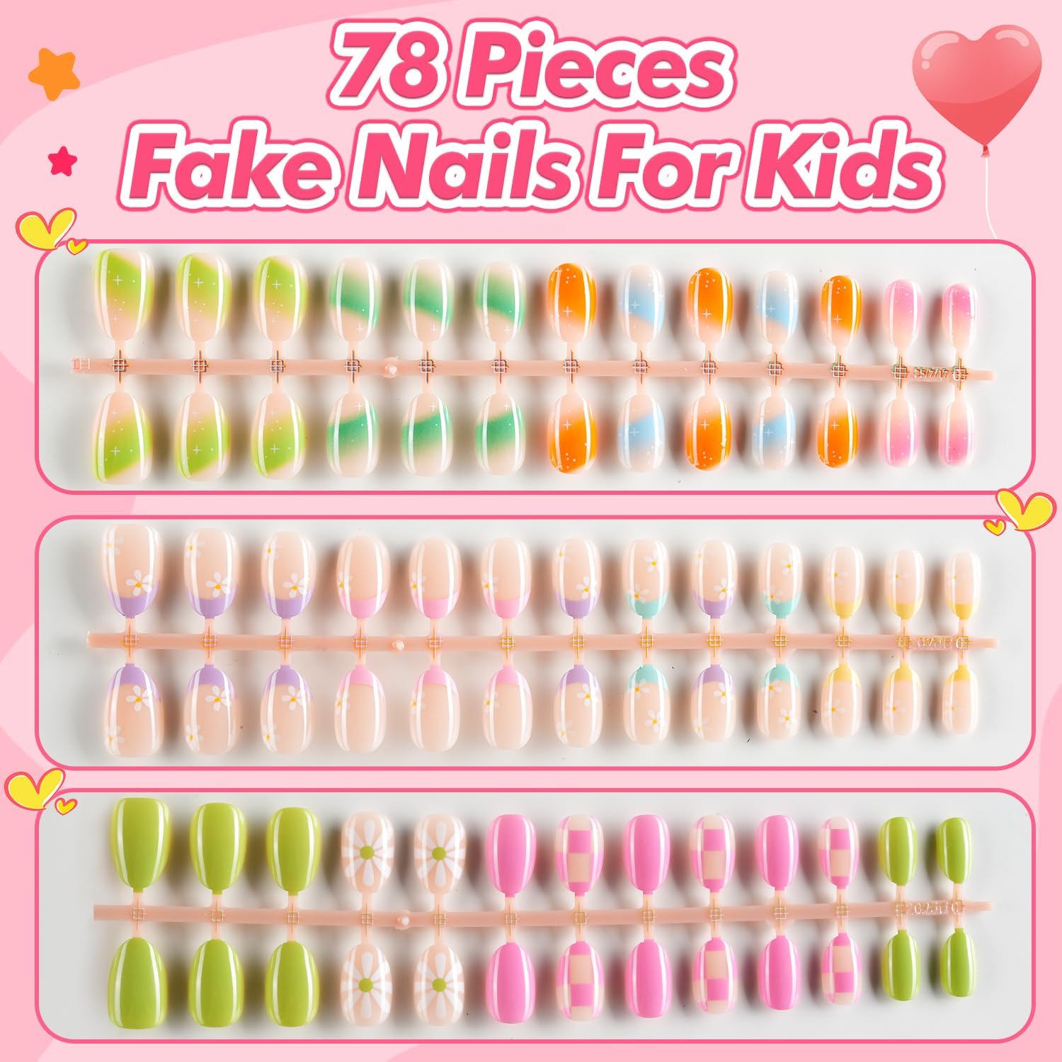 【Conjunto de unhas de pressão infantil】 78 peças de unhas postiças infantis em nosso pacote e 10 g de cola para construção de unhas. Desenhos animados fofos com cores vibrantes e temas de férias, temos algo para todas as personalidades e ocasiões. Perfeito para se vestir, aniversários, Dia das Bruxas ou apenas porque!