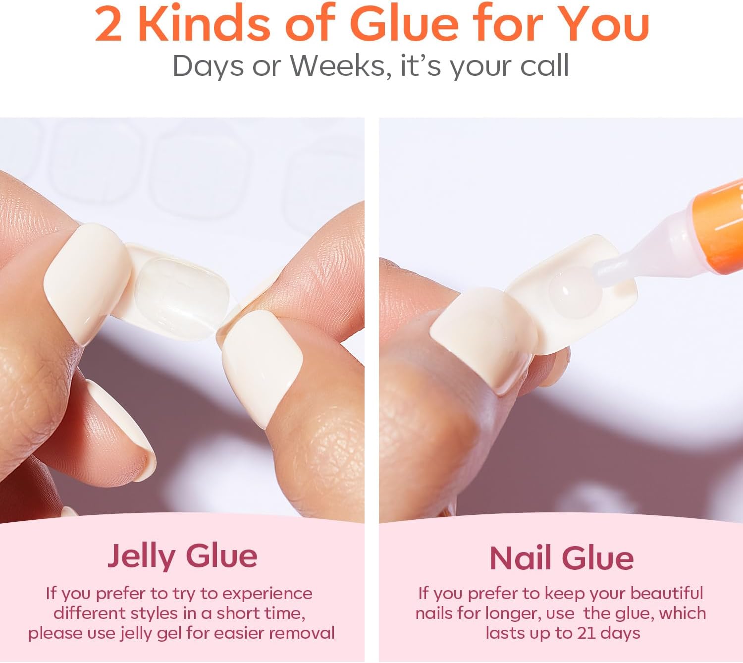 Long-lasting Fake Nails: High-Grade Acrylic, ABS, Non-toxins, no smell, no harm to your nails and health, which patches adhere seamlessly to your natural nails and have a long-lasting durability of 20 days or more