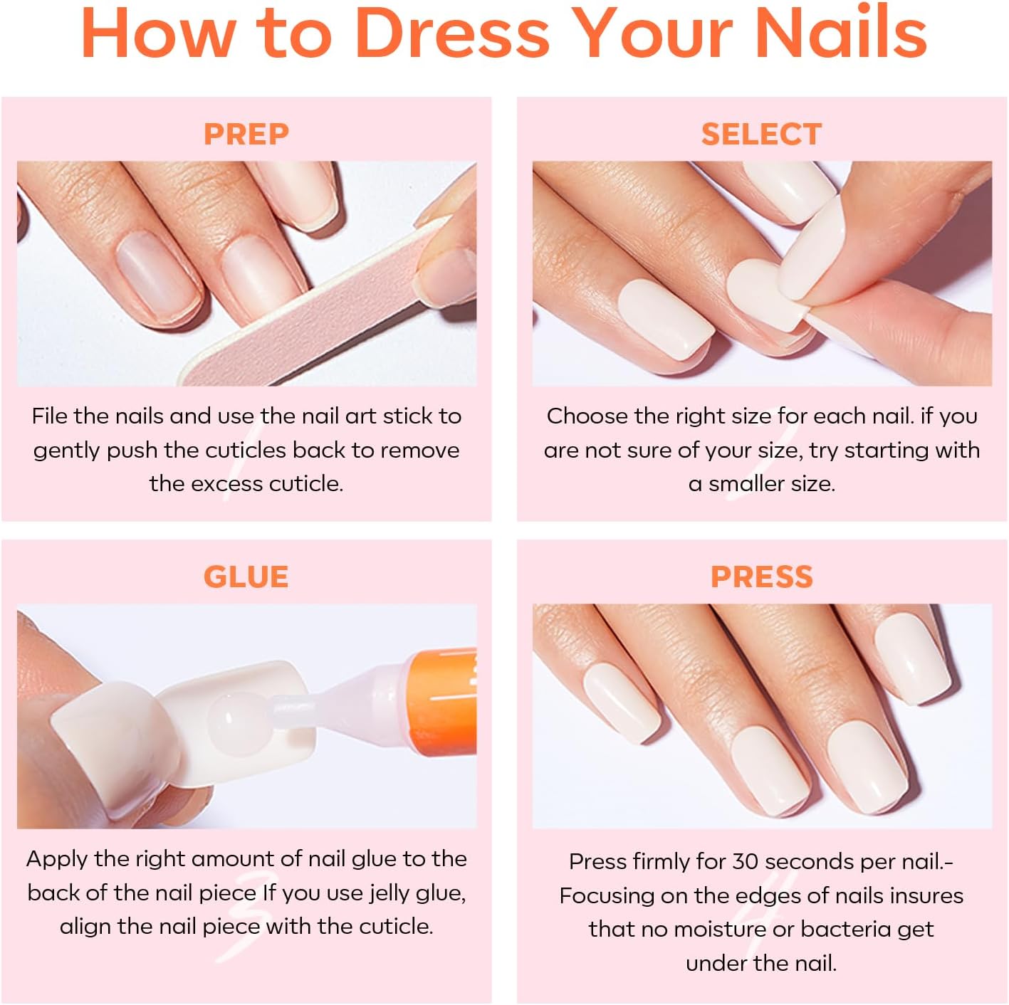 32 pcs Nails in 16 Sizes: The press on nails kit comes with 32pcs fake nails in 16 different sizes to suit each finger, each set comes complete with a nail glue, 2 sheets jelly adhesive tabs, double-sided nail file, cuticle stick, and prep pad
