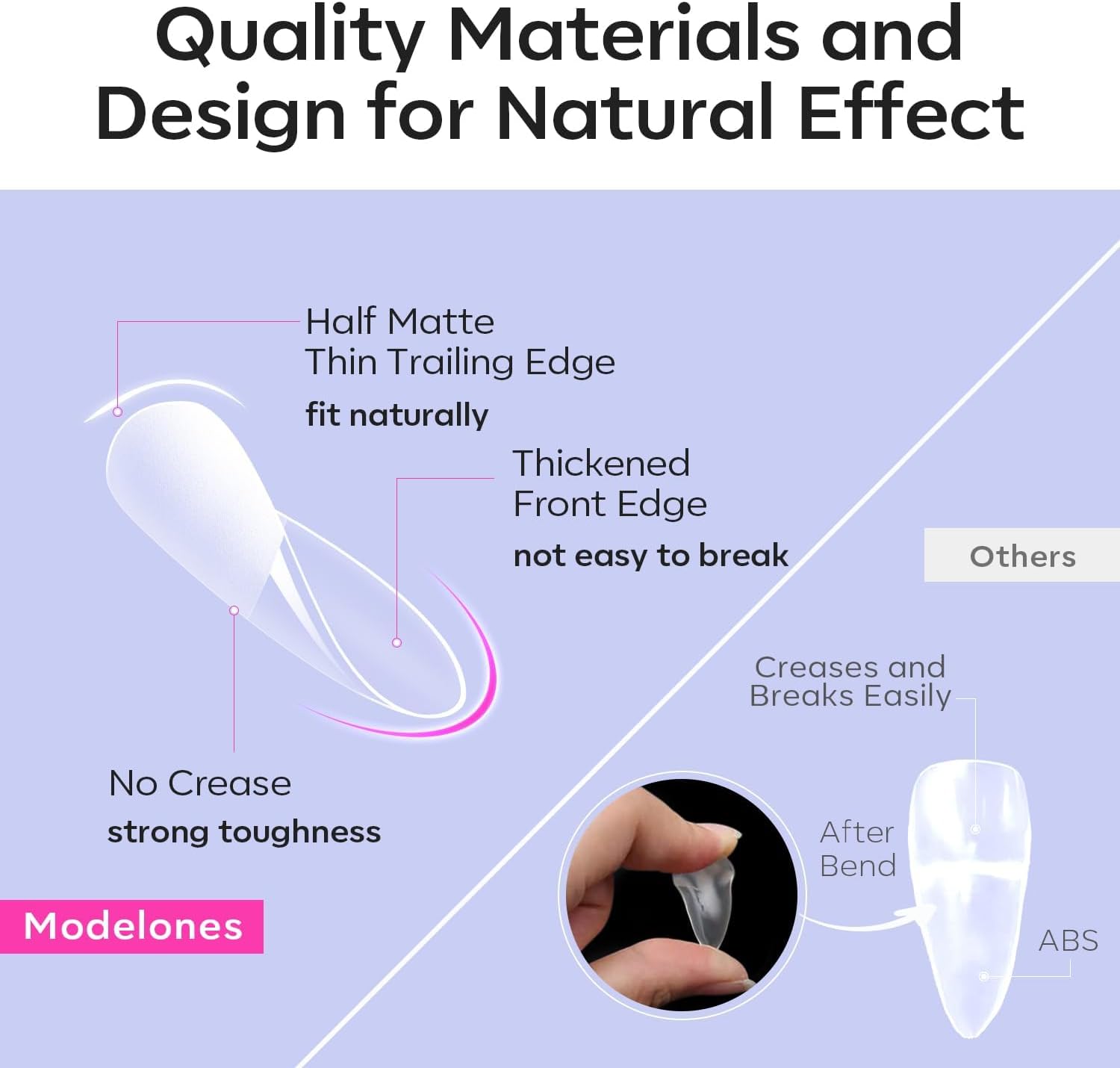 Upgraded Half Matte Pointed Almond Nail Tips: You can easily extend your nails and enjoy the fun of DIY manicure with Modelones pre-buff gel nail tips! Half-matte texture design for increased friction and increases adhesion
