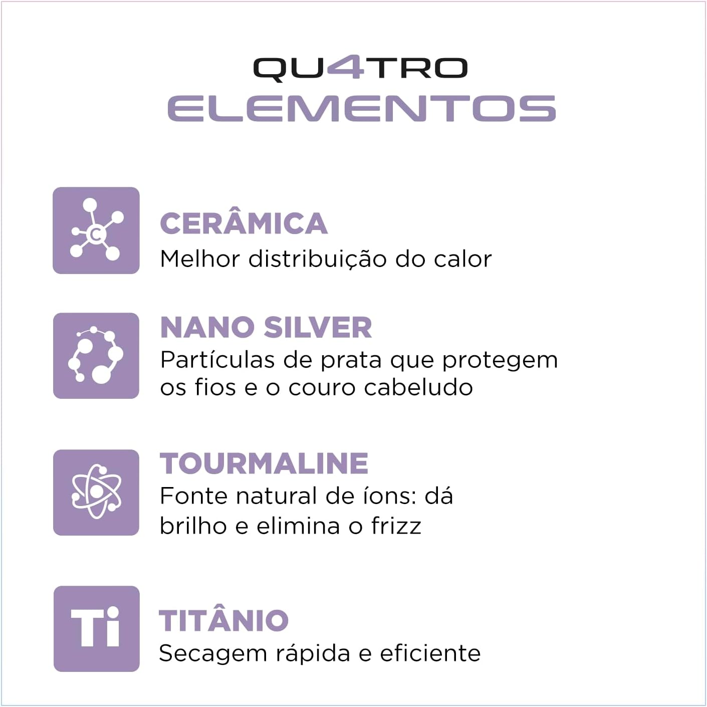 Revestimento Especial com Quatro Elementos: Revestimento enriquecido com infusão de Cerâmica, Titânio, Tourmaline e Nano Silver. Os 4 elementos, juntos, protegem seus fios e garantem uma aparência mais saudável aos cabelos;