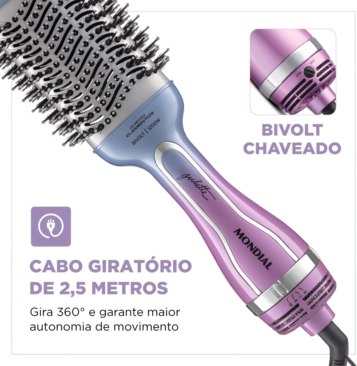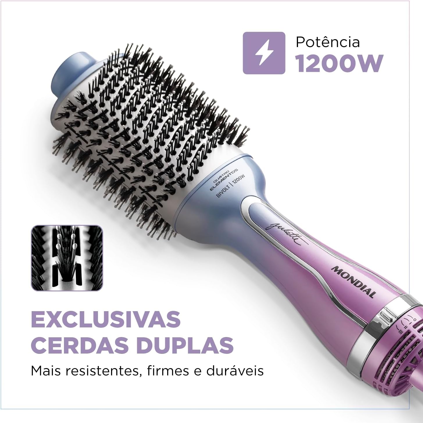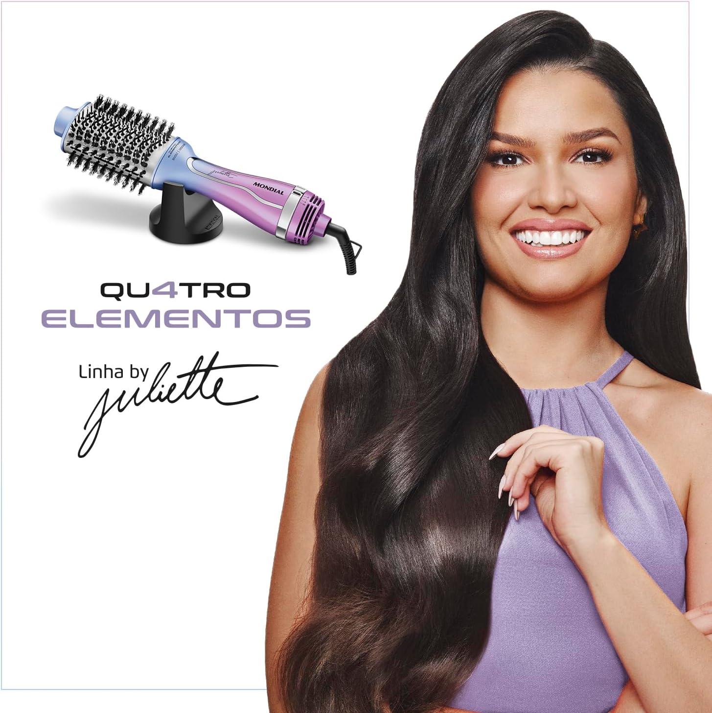 A Escova Secadora da Linha by Juliette Qu4tro Elementos traz um revestimento especial enriquecido com infusão de Cerâmica, Titânio, Tourmaline e Nano Silver. Esses 4 elementos, juntos, protegem seus fios e garantem uma aparência mais saudável aos cabelos, com brilho intenso, maciez e sem frizz. Saiba mais sobre a Escova Secadora ES-JU-03: