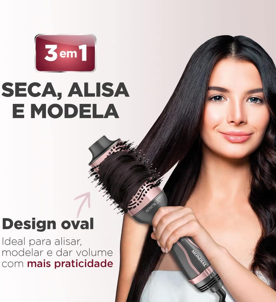 3 em 1: A escova Mondial seca, alisa e modela. Mais praticidade para o seu dia a dia!