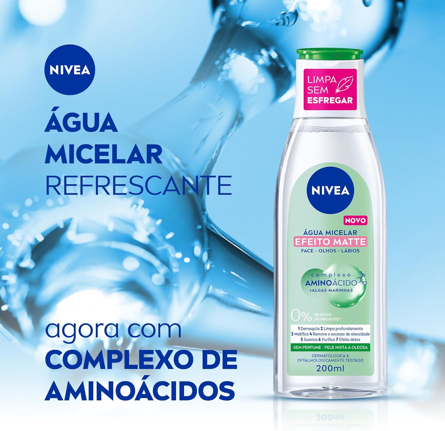 O que é? NIVEA Água Micelar Solução de Limpeza Facial 7 em 1 Efeito Matte é uma solução de limpeza que retira todas as impurezas da pele, inclusive resíduos de maquiagem.Para que serve?Com complexo de aminoácidos e algas marinhas em sua fórmula, NIVEA Água Micelar Solução de Limpeza 7 em 1 Efeito Matte demaquila, limpa profundamente, matifica, remove o excesso de oleosidade, suaviza, purifica e promove efeito detox.Pode ser usado diariamente para retirar a maquiagem e fazer a limpeza das impurezas. Dermatologicamente e oftalmologicamente testado, é indicado para a pele do rosto, lábios e região dos olhos, não sendo necessário enxaguar.