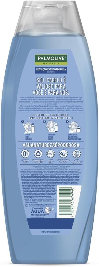 Shampoo Palmoline Naturals com embalagem econômica: rende até 35 lavagens (usando a quantidade recomendada de 18ml por lavagem).