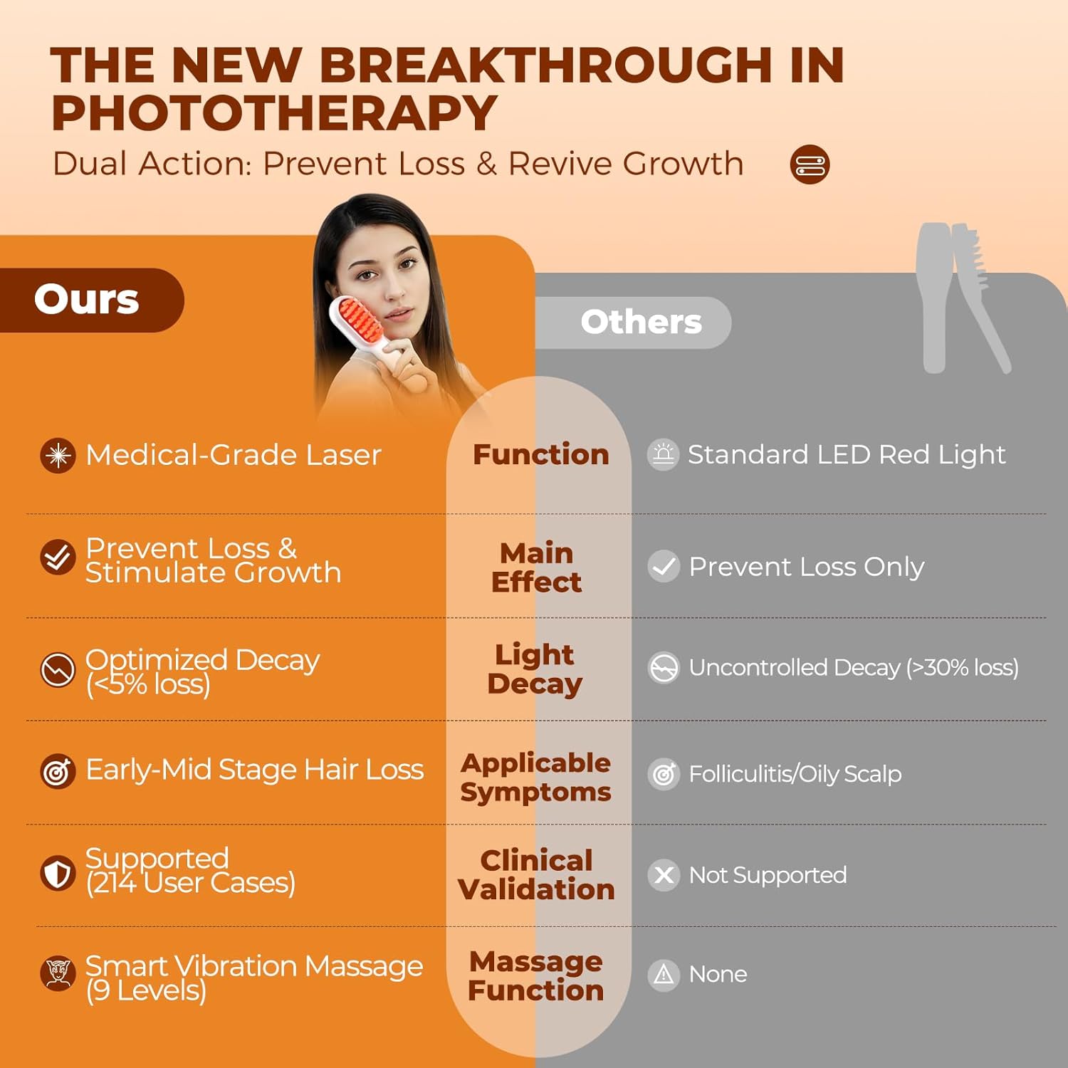 Design destacável magnético higiênico: terapia de luz vermelha para crescimento do cabelo, a cabeça do pente se desprende sem esforço com um clique para uma limpeza completa. Feita com cerdas de silicone flexíveis e uma superfície lisa, o design amigável ao couro cabeludo garante conforto.